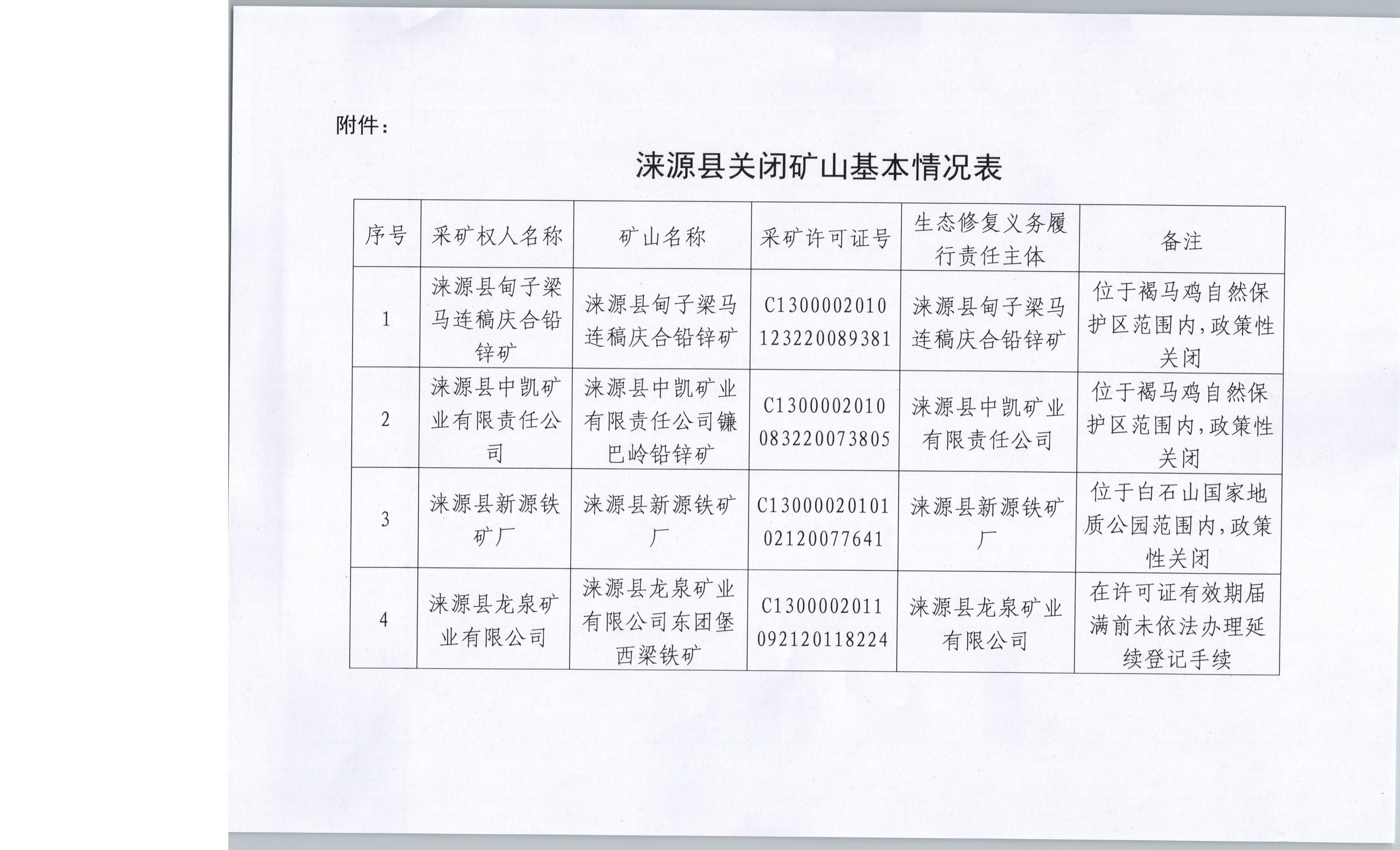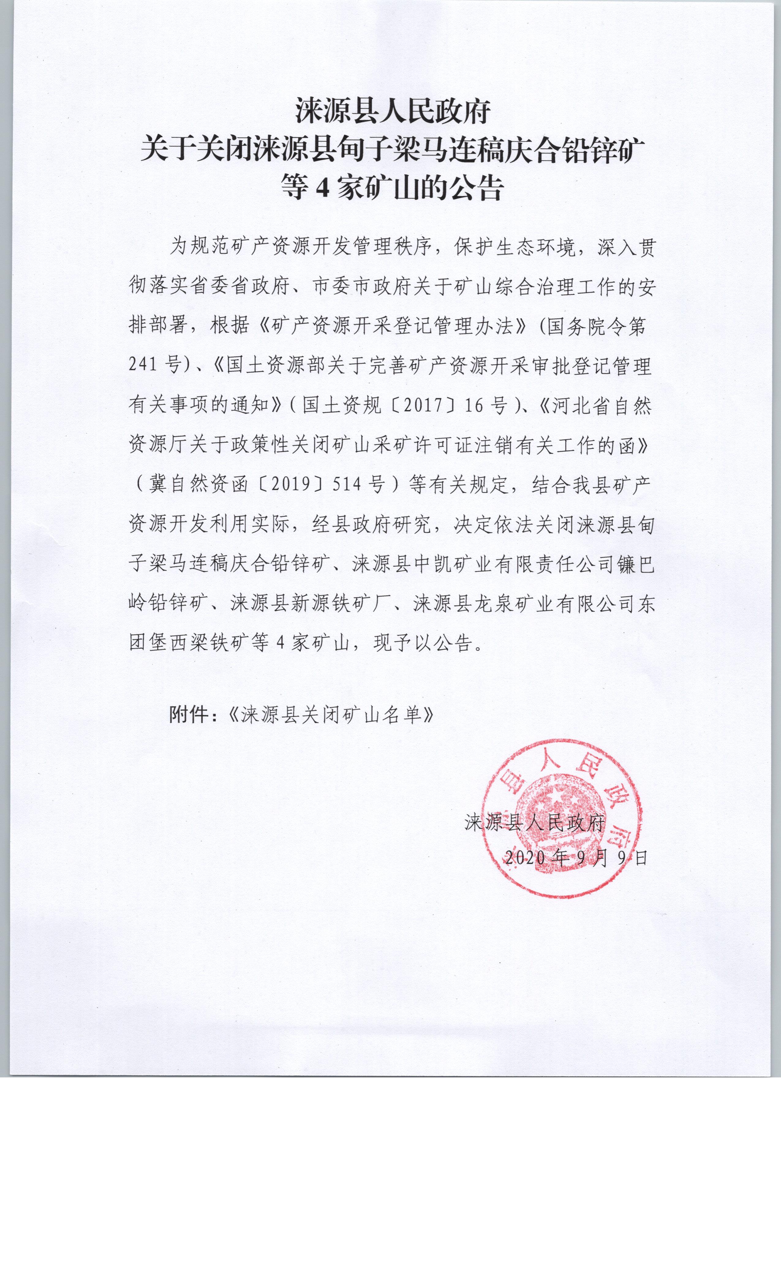 关于关闭涞源县甸子梁马连稿庆合铅锌矿等4家矿山的公告