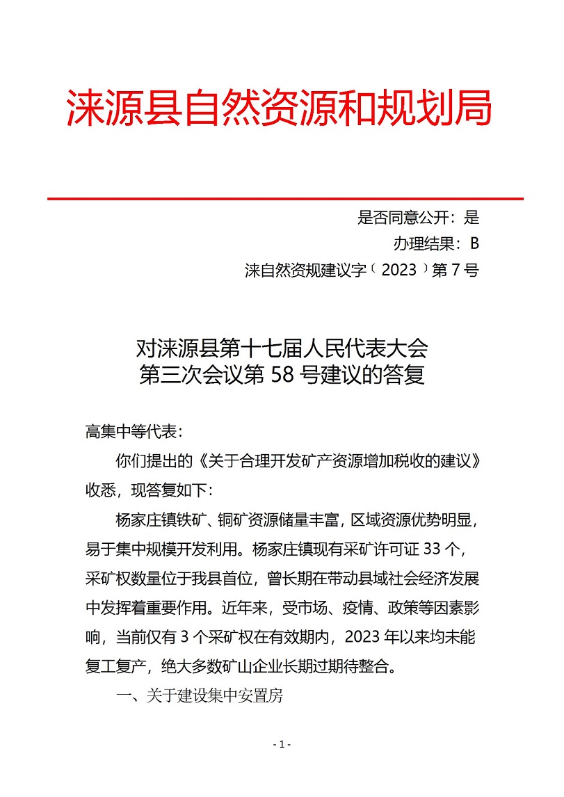 涞源县自然资源和规划局对涞源县第十七次人民代表大会第三次会议第58号建议的答复