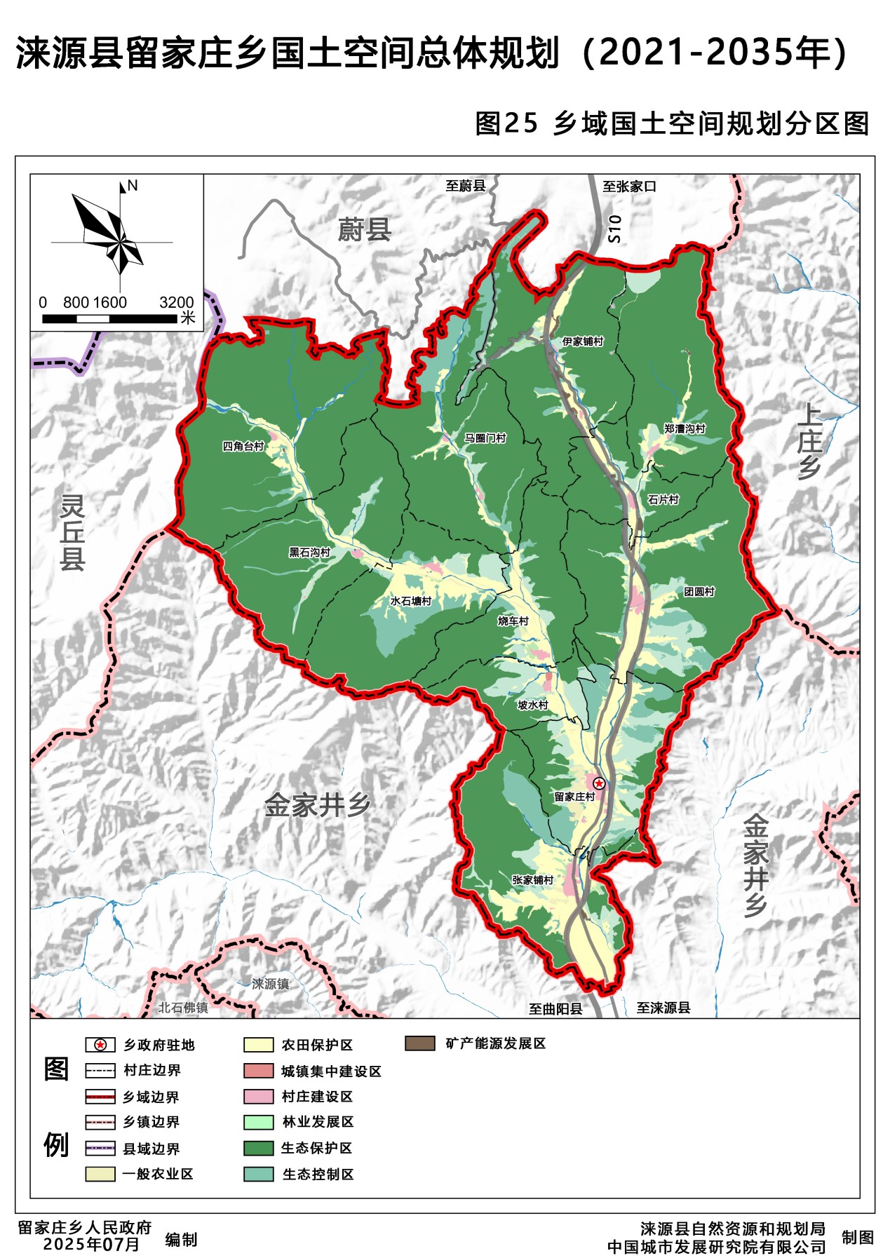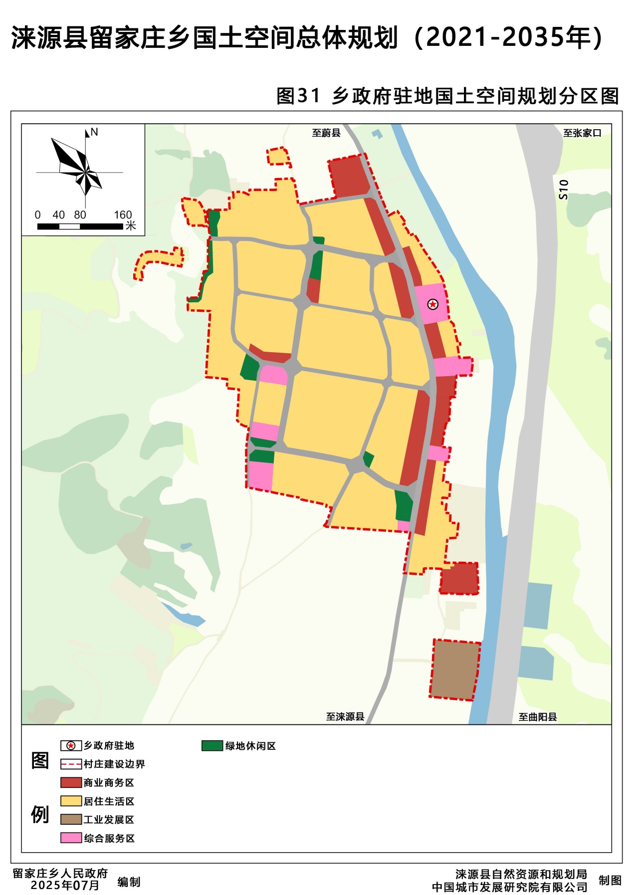 关于《涞源县留家庄乡国土空间总体规划(2021-2035年)》批后公告 《涞源县留家庄乡国土空间总体规划(2021-2035年)》(以下简称《规划》),于2025年7月23日获涞源县人民政府批复(〔2025〕73号)。现根据《中共中央国务院关于建立国土空间规划体系并监督实施的若干意见》(中发〔2019〕18 号)、《中华人民共和国城乡规划法》、《河北省城乡规划条例》、《中华人民共和国政府信息公开条例》等法律法规,现对《规划》成果予以公开。 一、规划期限 2021-2035年 二、规划范围 留家庄乡行政管辖范围,总面积约140.98平方公里,辖12个行政村;本次规划乡政府驻地位于留家庄村,总面积为27.80公顷。 三、乡镇性质 以发展休闲康养、山地农业、生态文旅为主的生态旅游与康养度假特色乡、山地绿色农副产品生产基地、太行山文化传承与研学基地。 四、产业空间布局 结合留家庄乡产业发展方向和生产力布局要求,规划乡以涞蔚公路为主要产业发展轴,带动全乡产业发展,形成“一核一轴三区”的特色产业布局。 一核。以留家庄乡政府所在地为基础,发展山地综合服务及产品集散商贸核心,以公共服务、旅游咨询、山地产品收购、加工、商贸和物流产业为主,带动乡域服务水平及山地产品生产、加工和销售运输发展。 一轴。以贯穿全境的涞蔚公路为支撑,联系留家庄乡域村庄和周边乡镇,是全乡重要的产业协同发展轴。 三区。以张家铺村、坡水村、烧车村、团圆村等为主形成特色林果生产区,主要以核桃、杏仁等特色林果种植为主,大力发展林下经济,带动农业产业向纵深发展。以水石塘村为主形成绿色杂粮生产区,发展方向为推行谷子、荞麦等绿色农业,实施标准化生产,打造高标准杂粮生产区。以伊家铺村、郑漕沟村、马圈门村、石片村为主形成传统坡地作物生产区,重点推动形成以玉米、马铃薯等传统作物种植为主,以适应贫瘠土壤条件的红小豆、黍子等特色作物为辅的传统坡地农业产业体系,提升农业产业化、规模化、市场化水平。 五、乡政府驻地规划规模与空间结构 (一)规划规模 坚持紧凑集约布局,优化提升城镇功能,创造良好人居环境。到2035年,严格控制乡政府驻地范围内村庄建设用地规模不超过27.80公顷。 (二)空间结构 规划形成“一心一带、一环多区”的乡政府所在地空间结构。 一心为乡政府所在地服务核心。依托乡政府、乡级卫生院、乡级商业设施形成城镇服务核心,位于乡政府所在地东部位置,辐射整个乡政府所在地,形成全乡的行政办公、医疗养老、公共活动中心。 一带为马圈沟河景观带,依托南北向流经乡政府驻地的马圈沟河,形成滨河景观带,在保障河流行洪作用的前提下,发挥休闲、观光等功能,与绿地共同构成乡政府所在地的蓝绿网络,结合公共空间塑造滨水休闲景观带。 一环沿乡政府驻地干路形成的城镇发展圈层。突出内外连接与综合服务功能,发挥公共服务与居住功能,沿轴线设置服务乡政府所在地的各类公服与商业设施,提升居民居住环境。沿东部干路设置两侧商业服务带,沿南北环串联多个绿色公园。 多区分别为中部居住片区、北部居住片区、南部居住片区及东部综合服务片区。居住片区内集中设置各类文化、教育、医疗设施,发挥集中的公共服务功能。同时结合居住片区现代化改造,完善各类服务配套设施,实现乡政府所在地居民安居乐业。