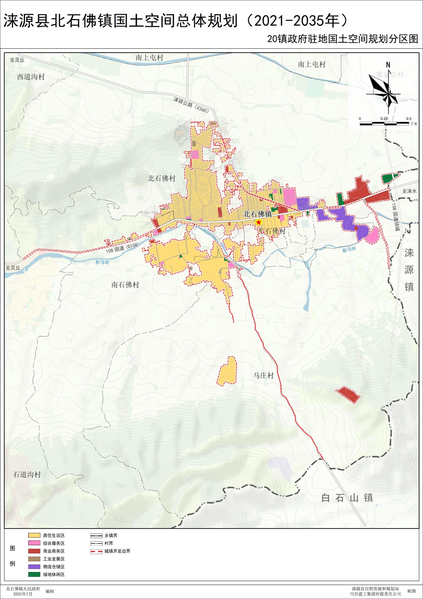关于《涞源县北石佛镇国土空间总体规划(2021-2035年)》批后公告 《涞源县北石佛镇国土空间总体规划(2021-2035年)》(以下简称《规划》),于2025年8月7日获涞源县人民政府批复(〔2025〕82号)。现根据《中共中央国务院关于建立国土空间规划体系并监督实施的若干意见》(中发〔2019〕18 号)、《中华人民共和国城乡规划法》、《河北省城乡规划条例》、《中华人民共和国政府信息公开条例》等法律法规,现对《规划》成果予以公开。 一、规划期限 2021-2035年。 二、规划范围 北石佛镇行政管辖范围,总面积约139.58平方公里,辖16个行政村;镇政府驻地规划范围为城镇开发边界围合范围,涉及北石佛村、南石佛村、东石佛村、马庄村,面积为137.16公顷。 三、城镇性质 以现代农业和农副产品加工为主的小城镇。 四、产业空间布局 结合北石佛镇产业发展方向和生产力布局要求,形成“一心、两轴、三区、多点”的产业空间布局结构。 一心:主要指集镇区形成综合服务中心,主要支撑整个镇域产业发展,提供农副产品加工、仓储、物流、贸易、展销等服务,同时布局居住、办公、商业、配套服务。 两轴:涞驿公路发展轴,形成连接北石佛镇各精品旅游项目的旅游发展轴。国道108发展轴,促进全镇发展的经济发展轴。 三区:农特产品区:发展壮大北石佛镇地区小米、苹果、秋子等特色农业产品资源优势,同时发展生态养殖业,重点养殖生态土鸡和跑山猪。围绕特色农业,不断培育壮大龙头企业,打造农业品牌,延伸产业链,尝试发展农产品初加工产业促进农业产业化进程不断加快;传统农业区:依托村庄现有的小麦、玉米、稻谷的种植基础,加大农村基础设施建设力度,完善水利设施建设,积极引入技术,发展特色化、现代化农业,建设高标准农田,保障粮食生产,促进农业高效发展,实现土地增产,农民增收;生态旅游区:依托河北涞源大龙门省级森林自然公园范围内优良的森林生态环境,结合自然教育、生态体验、运动健身等主题内容,打造与自然融合的生态旅游。 多点:加快镇域内精品旅游项目打造:刘家嘴永安堡、张鉴墓、北石佛香山寺佛龛、西道沟古堡、驿马岭战役遗址、凌云厂旧址、英雄门合故里、朝阳古洞等历史文化和红色文化旅游项目;河北涞源大龙门省级森林自然公园、西道沟花海观景平台等自然旅游项目。 五、镇政府驻地规划规模与空间结构 (一)规划规模 坚持紧凑集约布局,优化提升城镇功能,创造良好人居环境。到2035年,严格控制镇政府驻地范围内建设用地规模不超过137.16公顷。 (二)空间结构 规划形成“一心、一轴、两组团”的镇政府驻地空间结构: 一心:为北石佛镇综合服务中心,依托镇政府布置行政办公、商业、医疗、教育等城镇服务功能。 一轴:沿国道108(京昆线)形成经济发展轴。 两组团:北部生活组团、南部生活组团。