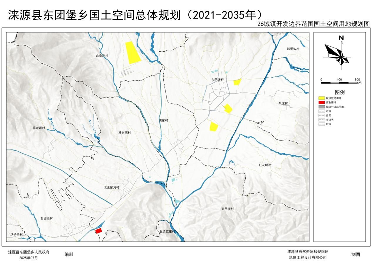 关于《涞源县东团堡乡国土空间总体规划(2021-2035年)》批后公告 《涞源县东团堡乡国土空间总体规划(2021-2035年)》(以下简称《规划》),于2025年8月7日获涞源县人民政府批复(〔2025〕82号)。现根据《中共中央国务院关于建立国土空间规划体系并监督实施的若干意见》(中发〔2019〕18 号)、《中华人民共和国城乡规划法》、《河北省城乡规划条例》、《中华人民共和国政府信息公开条例》等法律法规,现对《规划》成果予以公开。 一、规划期限 2021-2035年 二、规划范围 乡域为乡行政辖区范围,面积为21051.20公顷。乡政府驻地范围为东团堡村范围。 三、职能定位 涞源县北部以发展特色农业、休闲康养为主的资源生态型一般乡镇。 四、产业空间布局 在农业方面,增加优良农产品品种的种植面积,进一步引进种植其他蔬菜品种。推广农业生产新技术的应用,提高农产品的科技含量和质量,发展绿色无污染种植业。积极改良农作物的品种,稳定粮食生产。山区特色农业区(北辛庄沙棘果种植基地和杨庄村珍珠油杏种植基地)稳步扩大种植规模。建设蔬菜批发和粮食交易市场,为农产品的销售提供平台,扩大粮食交易服务范围,形成乡村的粮食交易中心。 依托车间进村项目,发展产业扶贫成立的制造厂及加工厂,提高工作效率,控制管理过程中的浪费,在管理模式、管理方法、管理手段、组织结构、业务流程等方面不断改革。不断地改进产品工艺和生产流程,使得成立的公司能够稳步发展,为周边村庄提供工作岗位,使得三大产业协调发展,带动乡域经济发展。同时,限制三类工业的发展,跳过传统工业化进程中先污染后治理的发展阶段,避免对城乡其他功能区造成污染,实现城乡各功能区的良性互动发展。 东团堡乡具有丰富历史和自然旅游资源,如东团堡烈士陵园、横子岭森林公园等。除此之外,在此地发生的历史战争也具有很大意义,如历史上萧太后在此修土堡退宋军、百团大战的东团堡攻坚战,具备发展旅游业的基础。 五、乡政府驻地规划规模与空间结构 乡政府驻地用地布局依据现状建设情况,综合考虑经济社会发展、资源禀赋、类型特征等多方面因素,规划形成“一心、两轴、一带、四片区”的空间格局。 “一心”:居民服务中心。居民服务中心位于乡政府驻地中部,结合周围广场形成乡政府驻地的一个门户空间。 “两轴”:乡政府驻地两条主要的发展轴,也是体现东团堡乡建设的形象轴。沿纵横两轴线布置主要的公共服务设施和商业。沿线乡镇建设统一规划,一体设计,运用相同设计元素铺垫街景统一的背景,在重要空间设置景观节点,力争使沿街风貌整齐统一而又不乏变化。 “一带”:商业带,通过对商业带的整顿,并结合当地文化底蕴统一设计规划,赋予乡政府驻地特有的文化内涵,提升乡政府驻地的整体形象。 “四片区”:南北向和东西向道路交叉分割而成的四片居住区。