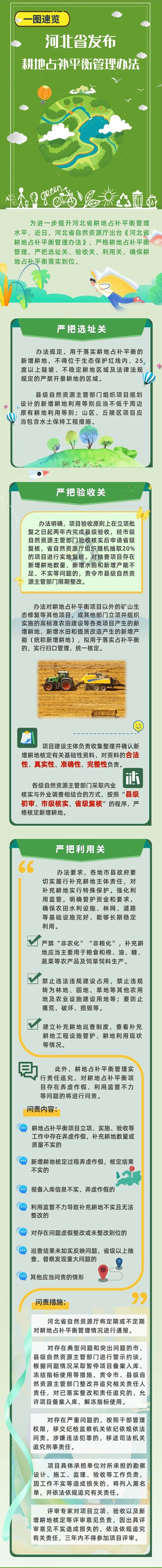 | 河北省耕地占补平衡管理办法 冀自然资规〔2022〕1 号 (2022年2月22日) 第一章 总 则 第一条 为加强耕地保护,规范耕地占补平衡管理工作,根据《土地管理法》《中共河北省委 河北省人民政府关于加强耕地保护和改进占补平衡的实施意见》(冀发〔2018〕35号)、《国土资源部关于严格核定土地整治和高标准农田建设项目新增耕地的通知》(国土资发〔2018〕31号)等有关法律法规和政策文件,结合实际,制定本办法。 第二条 本办法适用于本省范围内耕地占补平衡管理工作,包括耕地占补平衡项目管理、用于落实占补平衡的新增耕地核定、补充耕地利用监管等。 第三条 坚持绿色发展理念,注重生态环境保护,控制成片未利用地开发;坚持统筹协调,拓宽补充耕地途径,统筹落实补充耕地任务;坚持严格管理,强化补充耕地全程监管,确保补充耕地真实可靠。 第二章 耕地占补平衡项目立项 第四条 项目应符合国土空间规划和用途管制要求。禁止开垦严重沙化土地,禁止违规毁林开垦耕地,禁止在生态保护红线内、25 度以上陡坡、不稳定耕地区域及法律法规禁止的其他区域开垦耕地。第三次全国国土调查和最新年度变更调查为耕地的地块,不得立项作为占补平衡新增耕地。 第五条 历史形成的未纳入耕地保护范围的园地、残次林地等适宜开发的农用地拟整治为耕地的,经县级人民政府组织可行性评估论证、省自然资源厅组织复核认定后可纳入耕地占补平衡项目立项范围。 第六条 平原地区现状为种植果树、林木的地块,拟恢复整治为耕地用于占补平衡的,应当同时符合以下条件:(一)地块在第二次全国土地调查中不是耕地和可调整地类;(二)已征得土地相关权利人同意;(三)涉及林地(包括部分园地但林业和草原主管部门纳入林地管理范畴)的,已征得林业和草原主管部门同意;(四)县级人民政府已组织相关专家完成可行性评估论证。 第七条 县级自然资源主管部门按照要求组织项目规划设计,规划设计的新增耕地利用等别应当不低于周边原有耕地利用等别;山区、丘陵区项目应当包含水土保持工程措施。项目规划设计应当征求农业农村、林业和草原、水利、生态环境等有关部门意见。 第八条 县级自然资源主管部门在同级人民政府组织下组织相关方面的专家,对项目规划设计的可行性、合理性、科学性等进行评审论证,参加评审的专家应当进行实地查看,出具评审意见。 第九条 项目涉及的土地地类面积以最新年度变更调查成果为准;涉及耕地质量等别以省自然资源厅备案的最新耕地质量等别数据库为准。 第十条 对符合要求的项目,由县级自然资源主管部门向县级人民政府申请项目立项。 第十一条 县级人民政府根据评审论证结论等批复立项。 第十二条 项目立项批复后,县级自然资源主管部门应当在10个工作日内,通过省自然资源厅“一张图”和综合监管平台(以下简称“监管平台”)提交审查材料(见附件1),向市级自然资源主管部门申请立项信息核实。市级自然资源主管部门核实项目选址和新增耕地地类、面积、质量等别等内容,对选址合理、地类正确、面积准确、耕地质量等别符合要求的,出具项目立项核实通知书。立项核实工作应当在10个工作日内完成。 第三章耕地占补平衡项目实施 第十三条 县级人民政府确定的项目承担单位负责具体组织项目实施。 第十四条 耕地占补平衡项目实施,应当依据国家和省有关规定,通过当地政府公共资源交易平台以招投标方式确定工程施工、工程监理等单位。 第十五条 项目实施应当严格按照批准的规划设计方案执行。确需变更项目设计的,县级自然资源主管部门按要求报经原批准机关批准。 第十六条 工程监理单位应当对工程施工全程监理。项目实施应当接受村民监督小组的监督。 第十七条 项目承担单位应当在项目实施地点设立标志牌,对项目设计单位、工程施工单位、工程监理单位、项目规模、工程内容、建设工期等主要信息进行公开,接受社会监督。 第十八条 市级自然资源主管部门应当定期对本市耕地占补平衡项目实施情况进行督导检查和技术指导。 第三章 耕地占补平衡项目验收 第十九条 项目竣工后,县级自然资源主管部门在同级人民政府组织下,会同农业农村等有关部门,组织村民代表和相关专家,对照项目规划设计方案等进行实地勘验,逐地块核实新增耕地数量、质量和工程建设等内容,对符合要求的项目出具验收报告,报送县级人民政府。县级人民政府依据验收报告等批复验收。 第二十条 本办法实施后立项的耕地占补平衡项目,原则上在立项批复之日起两年内完成县级验收。逾期省厅不再受理项目验收入库。 第二十一条 县级自然资源主管部门应当在项目验收批复后10个工作日内,通过“监管平台”提交审查材料(见附件 1),向市级自然资源主管部门申请验收核实。市级自然资源主管部门对项目进行内业核实和外业调查,同时符合下列条件的通过验收核实:(一)工程数量和质量达到要求;(二)新增耕地数量、新增水田和新增产能真实准确;(三)档案资料保存完整。市级自然资源主管部门对通过验收核实的,下达验收通过核实意见书;未通过核实的,督促县级限期整改,整改完成后重新组织验收核实。内业核实应当在10个工作日内完成,外业调查应当在30个工作日内完成。 第二十二条 通过市级验收核实的项