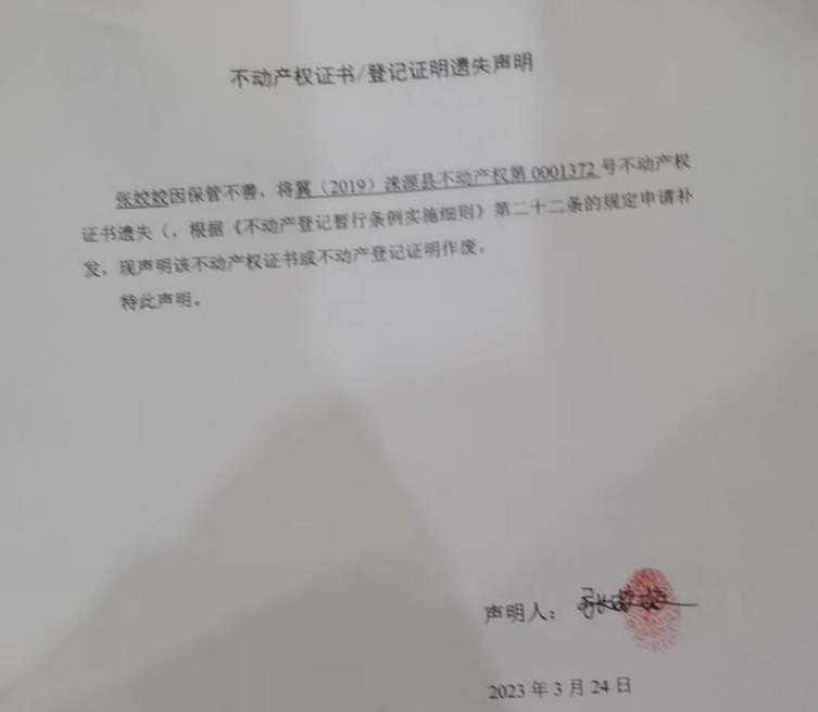 涞源县不动产登记中心不动产权证书遗失声明