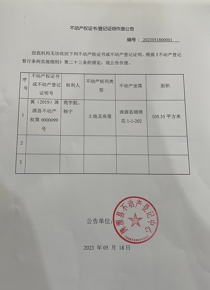 涞源县不动产登记中心不动产权证书作废公告