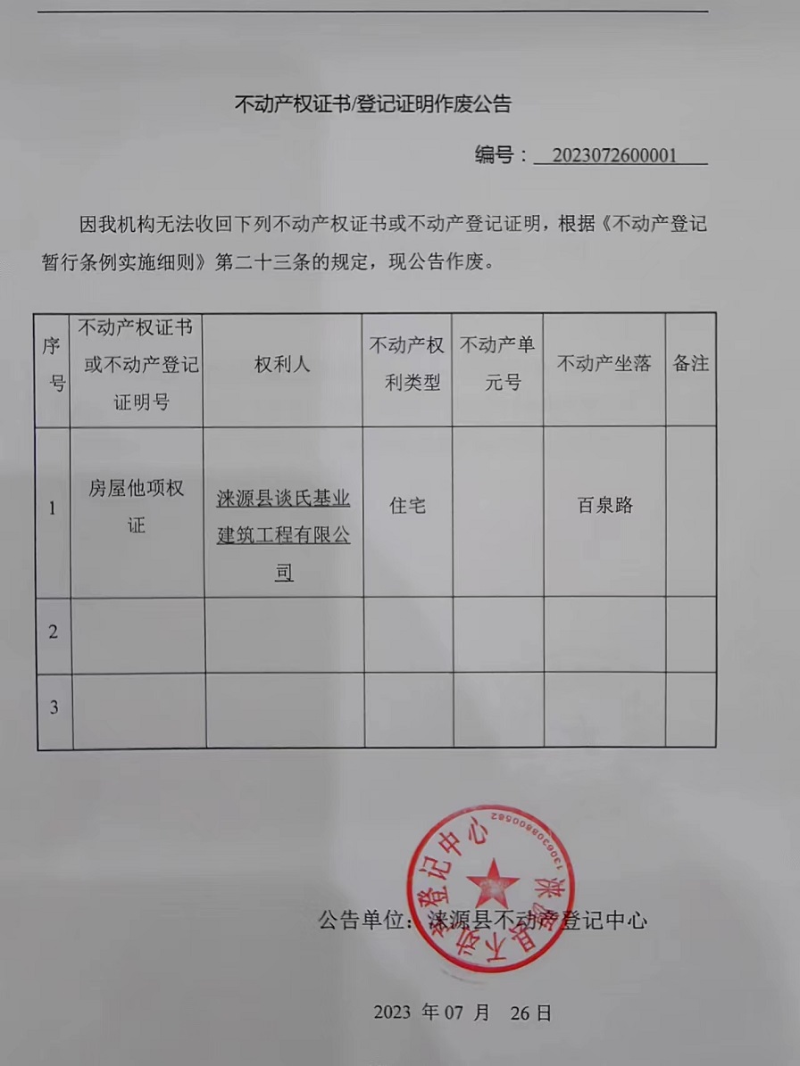 涞源县不动产登记中心不动产权证书作废公告