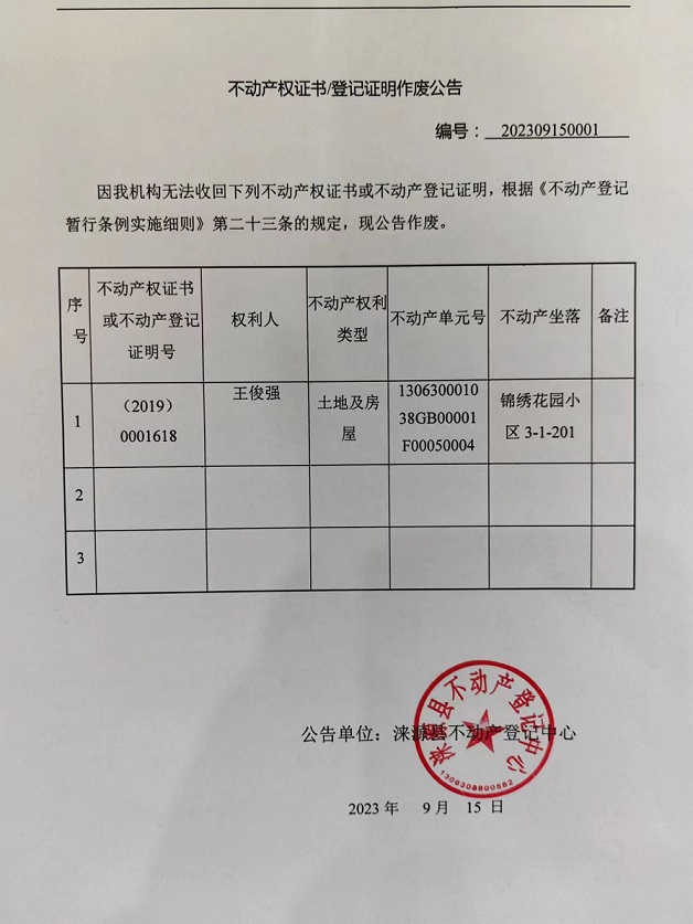 涞源县不动产登记中心不动产权证书作废公告