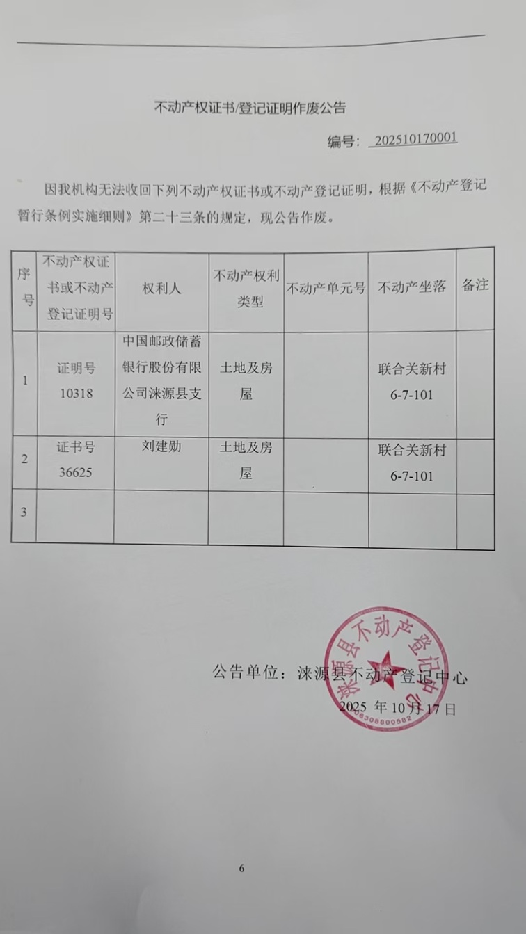 涞源县不动产登记中心不动产权证书作废公告
