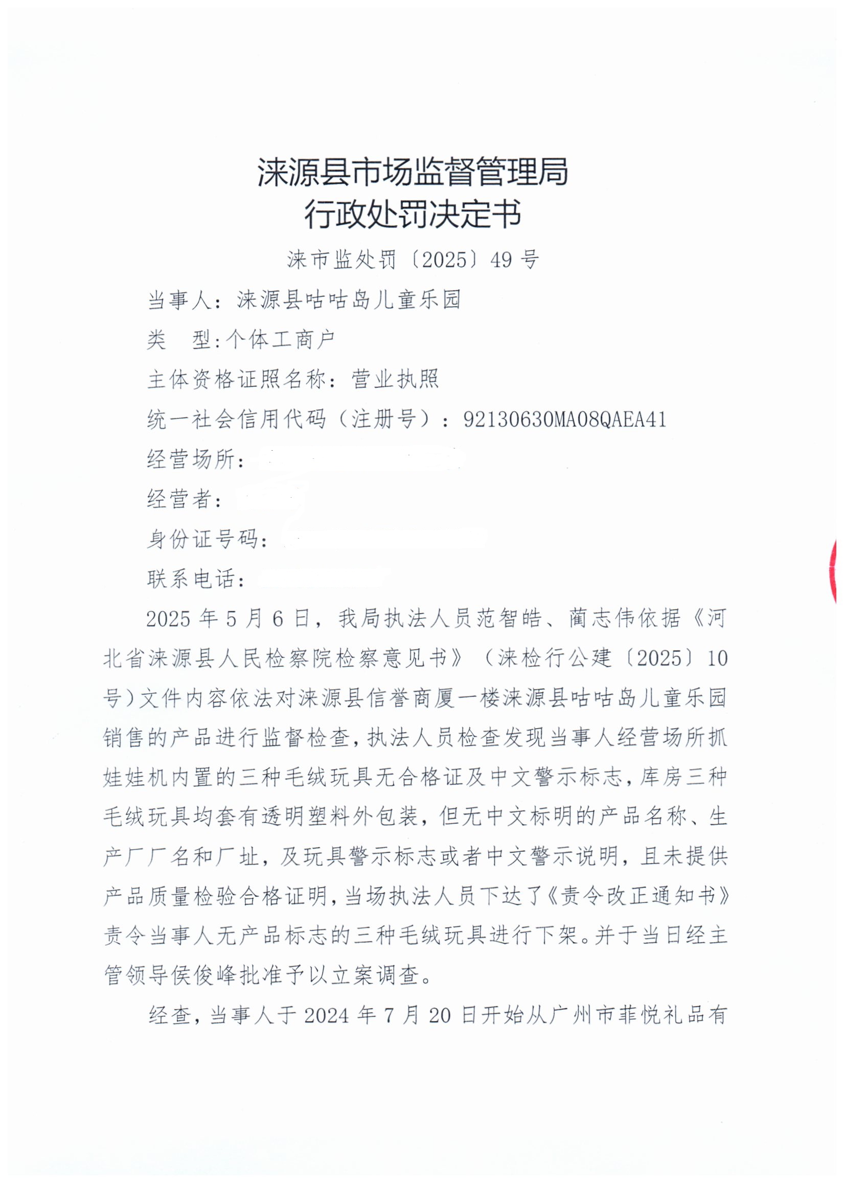 涞市监处罚〔2025〕49号 涞源县咕咕岛儿童乐园经营无产品中文警示标志毛绒玩具案