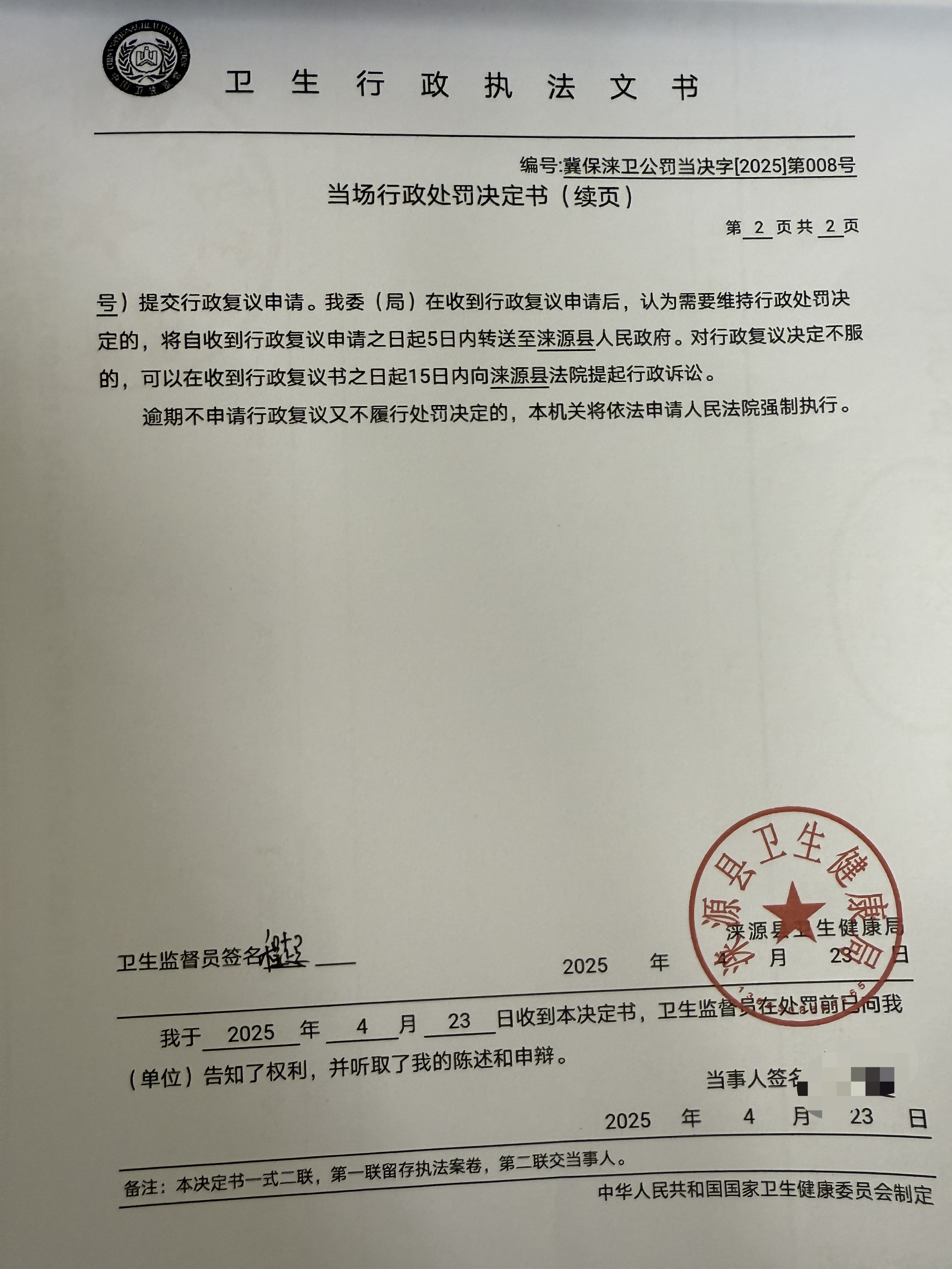 冀保涞卫公罚当决字【2025】第008号剪约风尚美发店违反《公共场所卫生管理条例》案