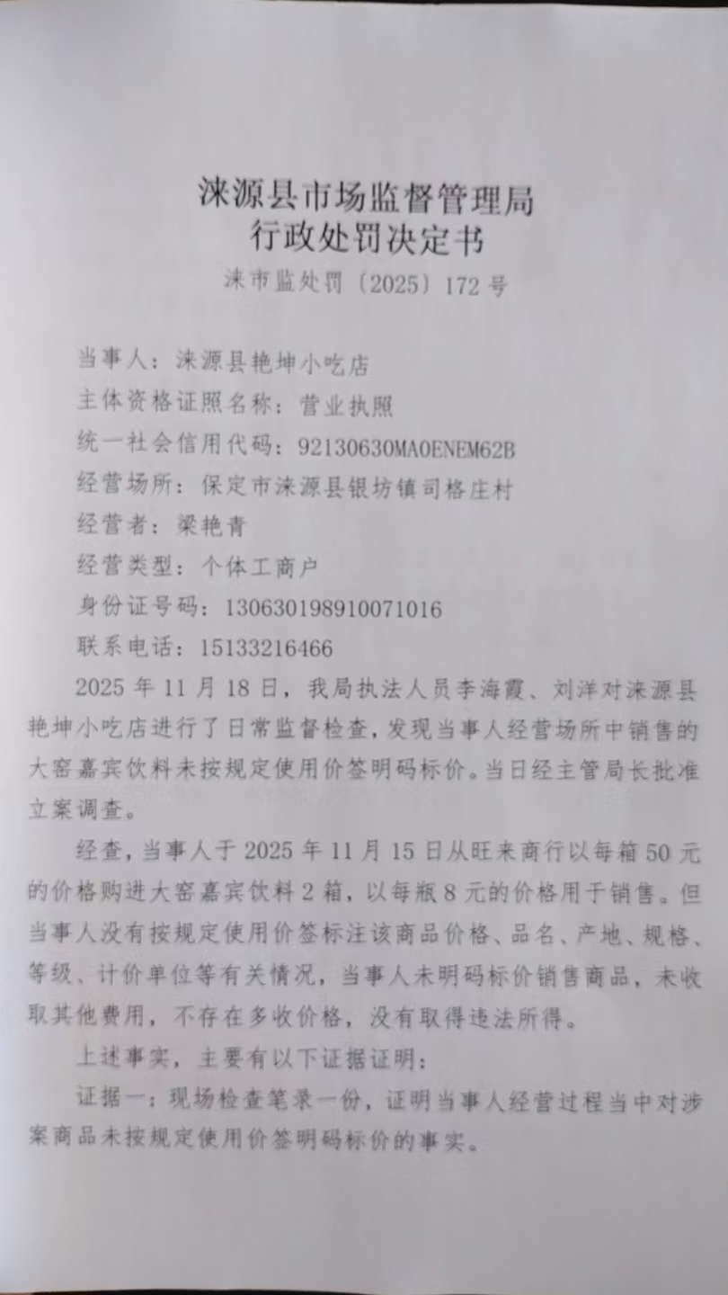 涞市监处罚〔2025〕172号涞源县艳坤小吃店销售商品未按规定明码标价案