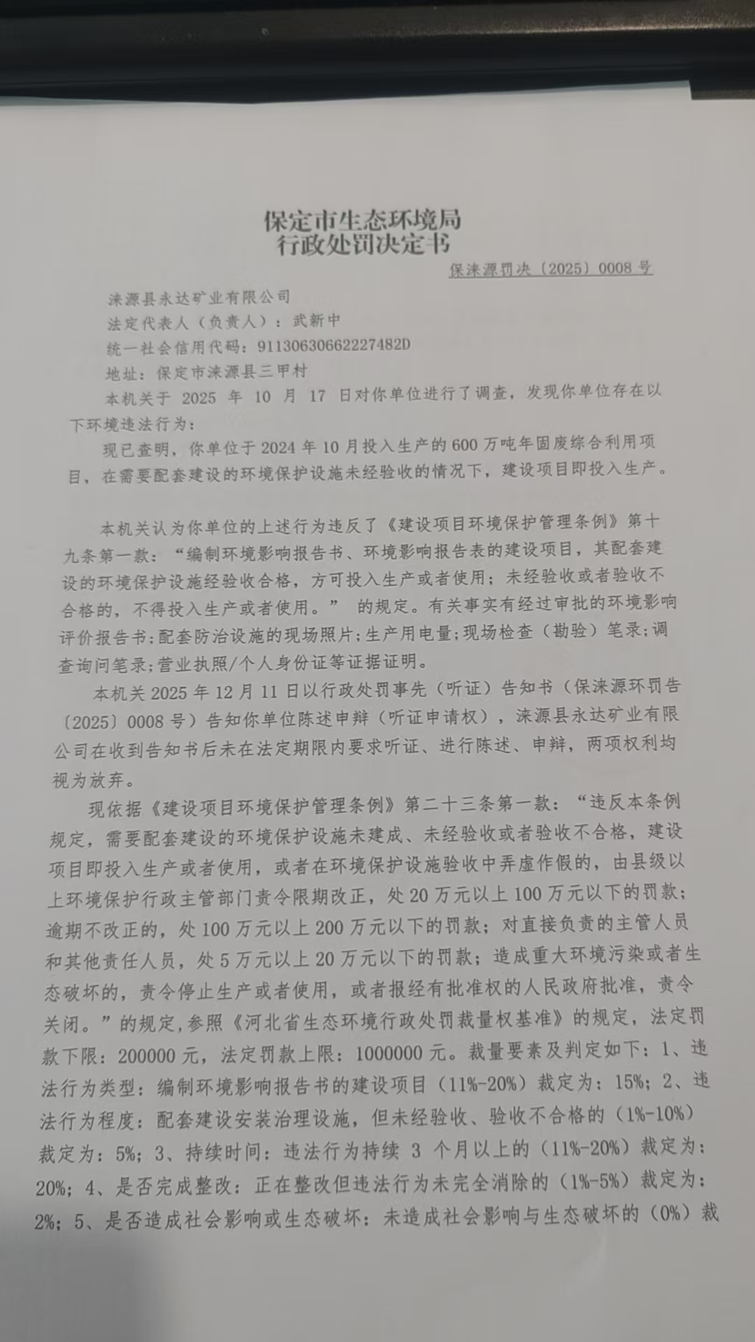 涞源县永达矿业有限公司行政处罚决定书保涞源罚决【2025】0008号