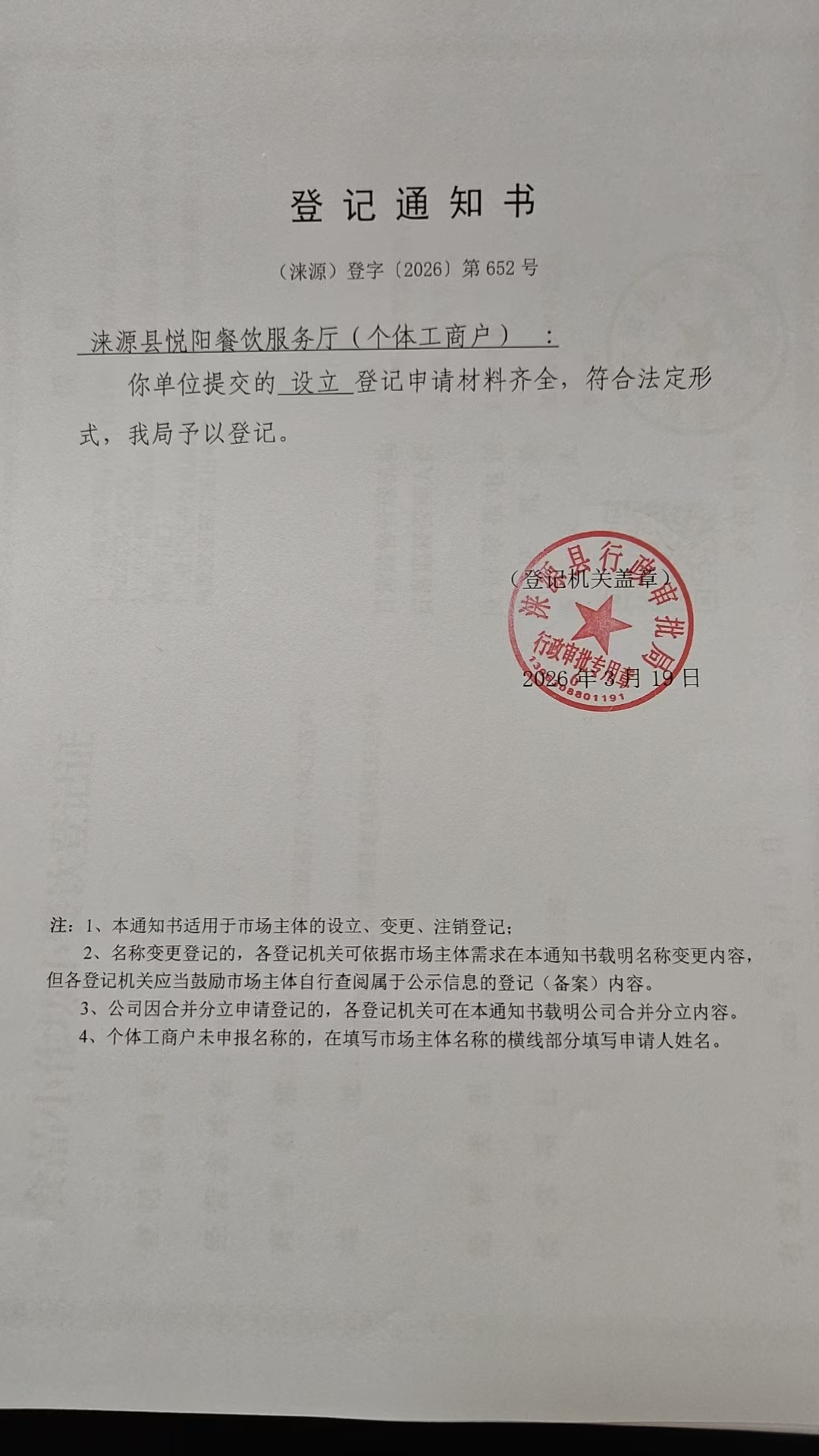 关于涞源县悦阳餐饮服务厅设立的公示