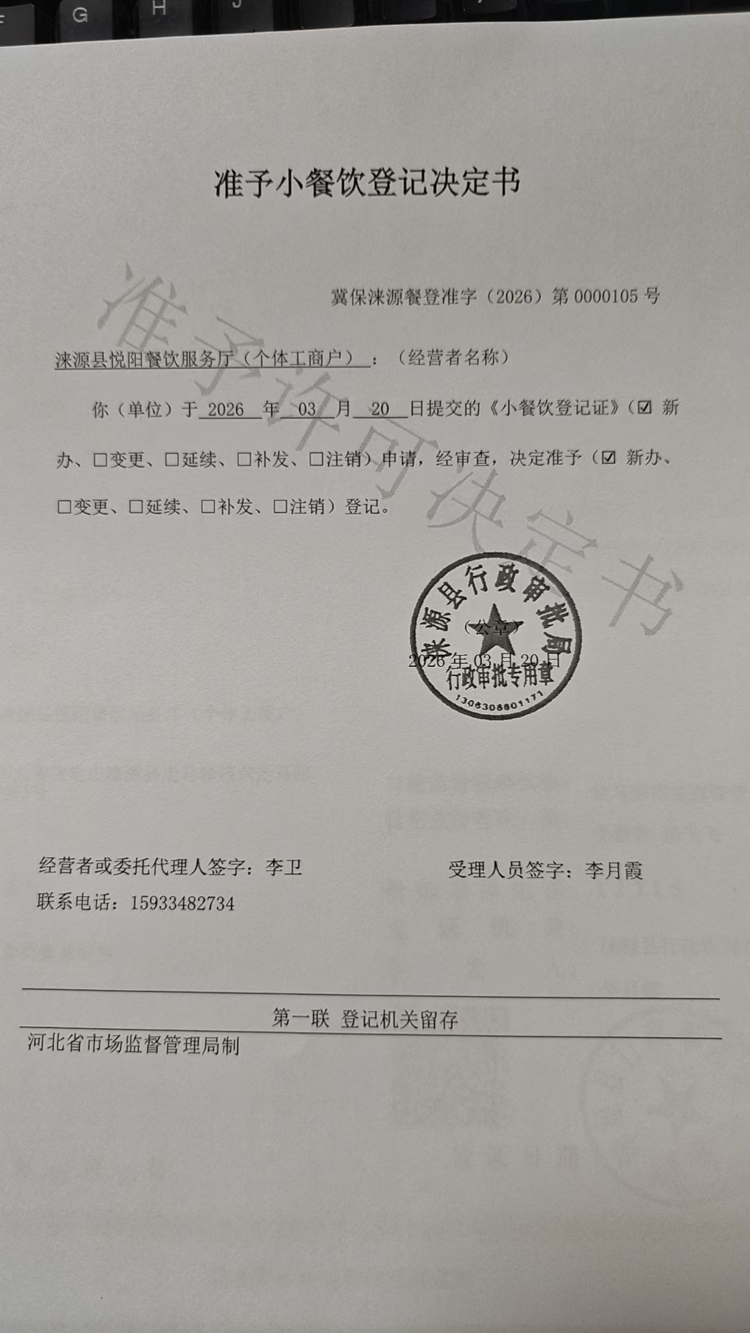 关于涞源县悦阳餐饮服务厅准予小餐饮登记决定的公示