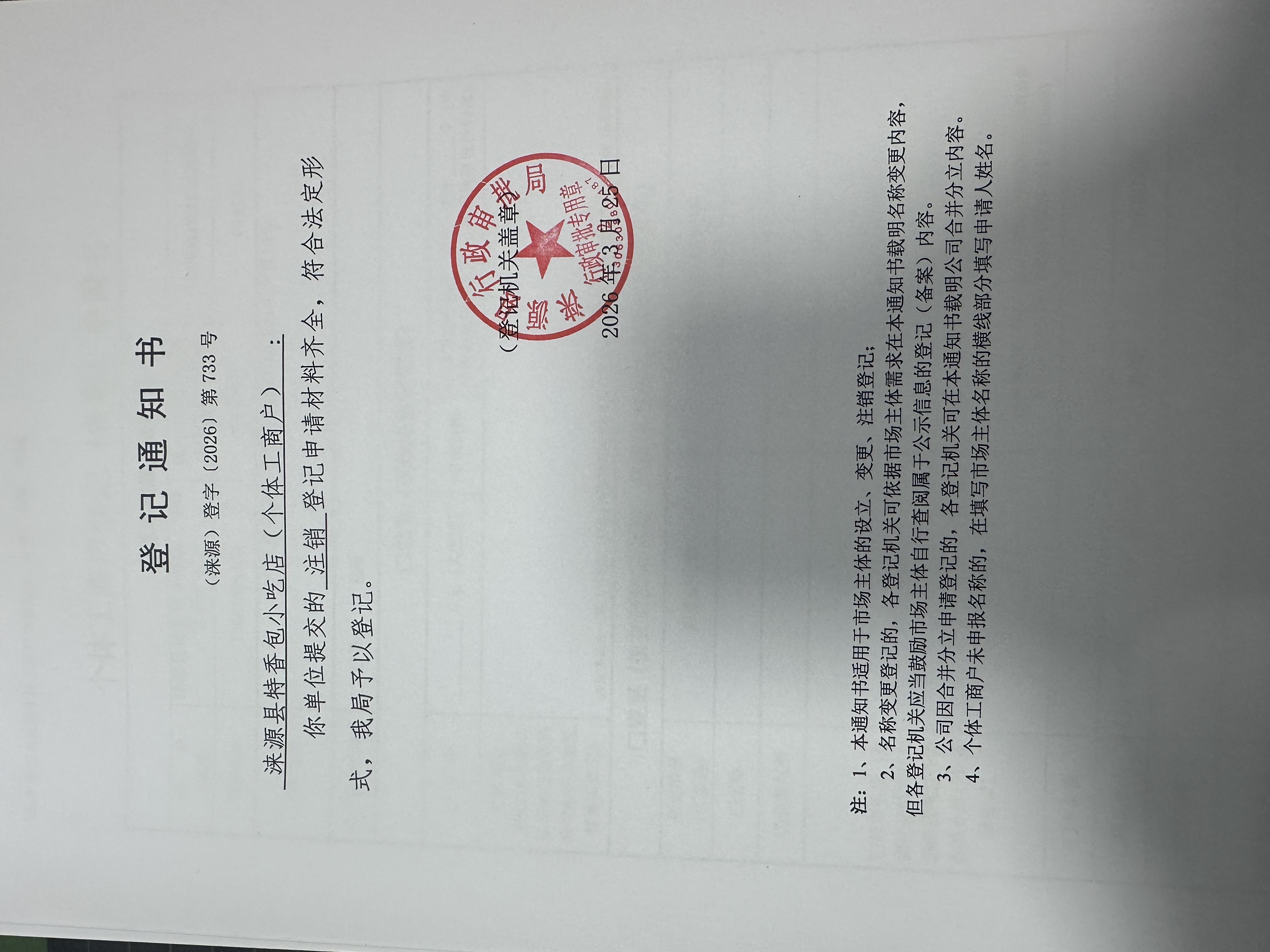 关于涞源县特香包小吃店注销的公示