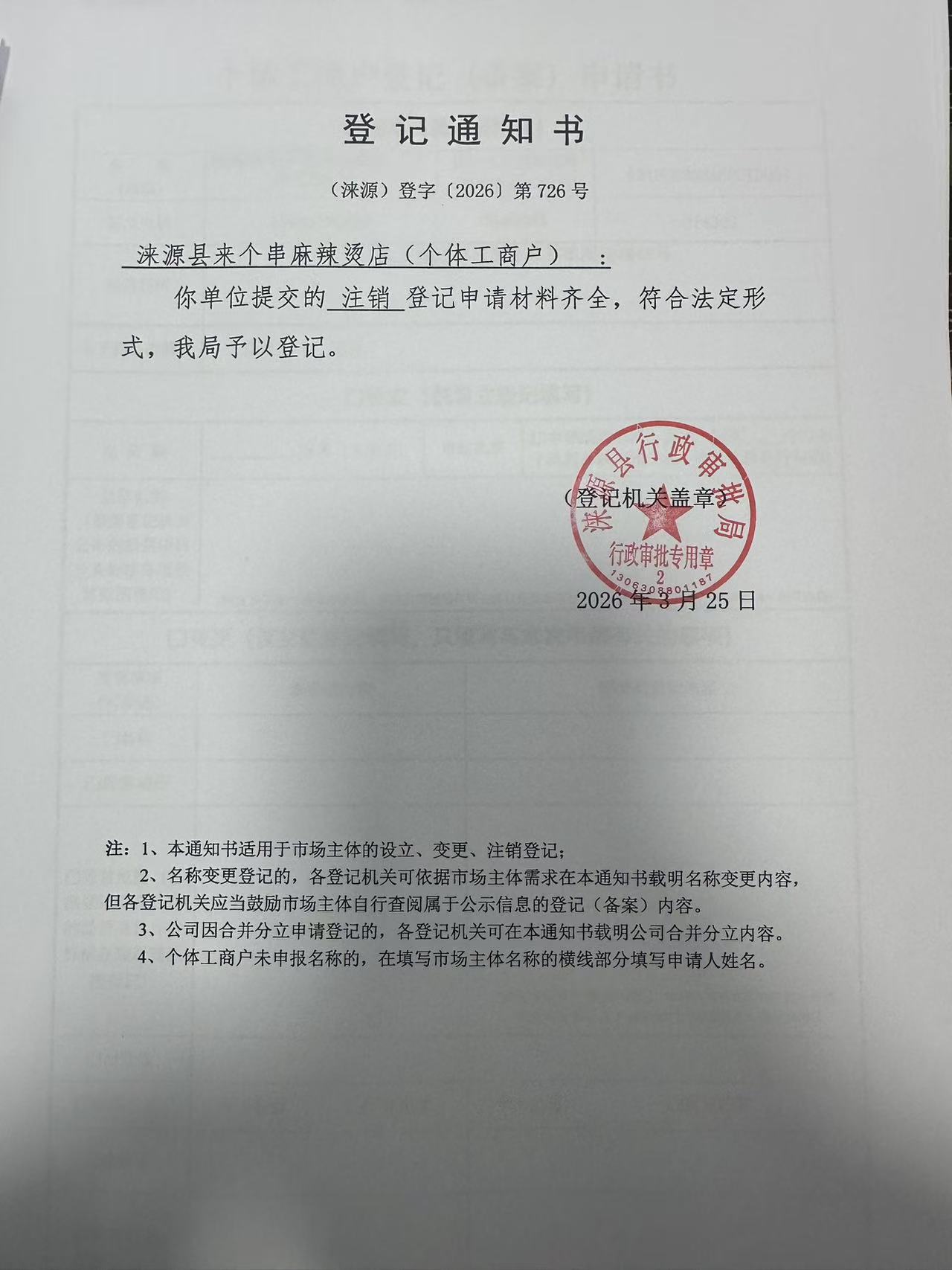 关于涞源县来个串麻辣烫店注销的公示