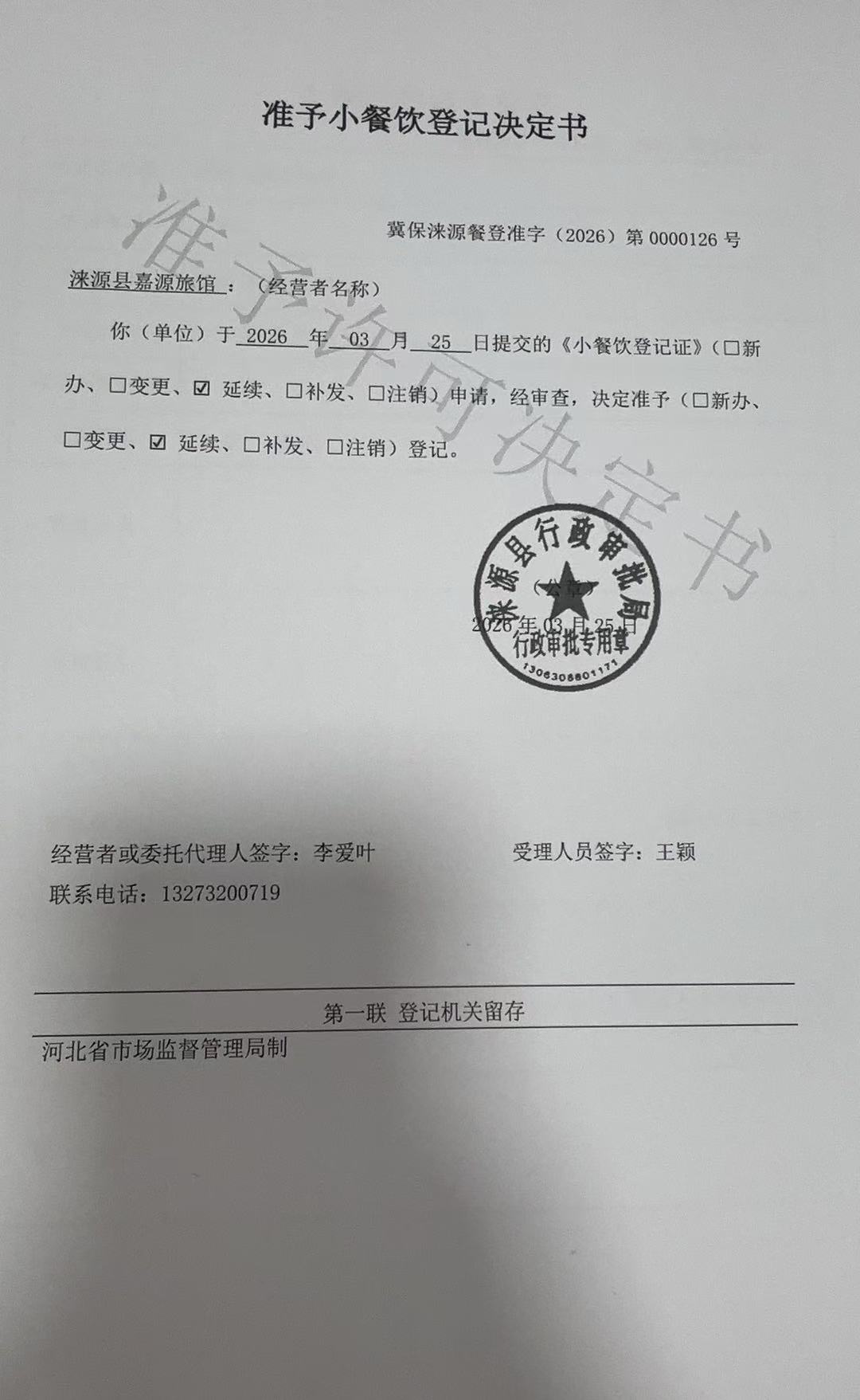 关于嘉源旅馆准予食品小餐饮登记决定的公示
