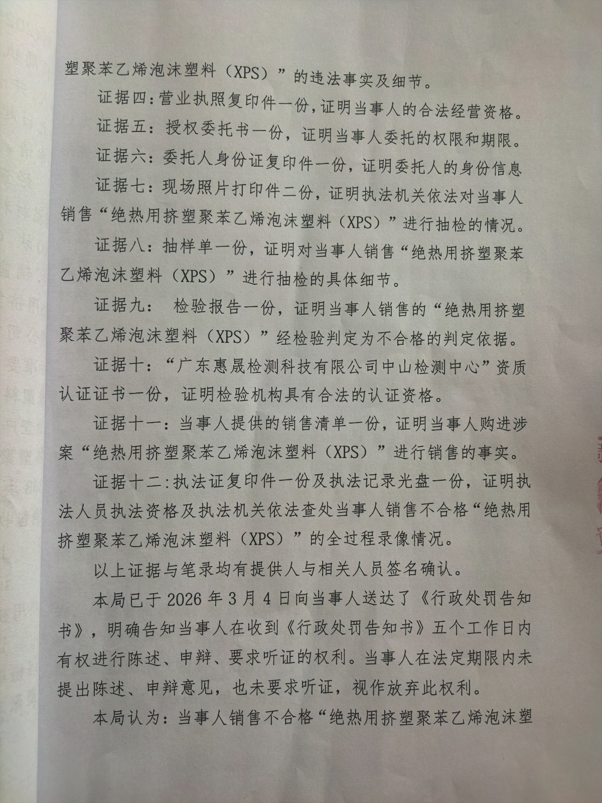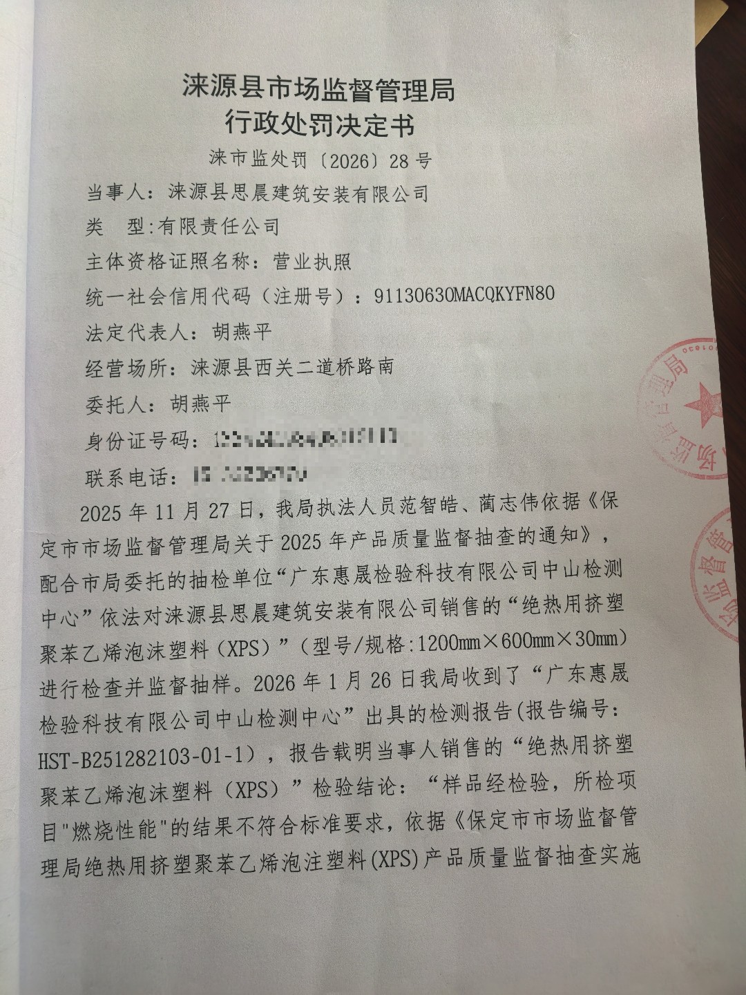 涞市监处罚〔2026〕28号,涞源县思晨建筑安装有限公司 销售不合格“绝热用挤塑聚苯乙烯泡沫塑料(XPS)”案