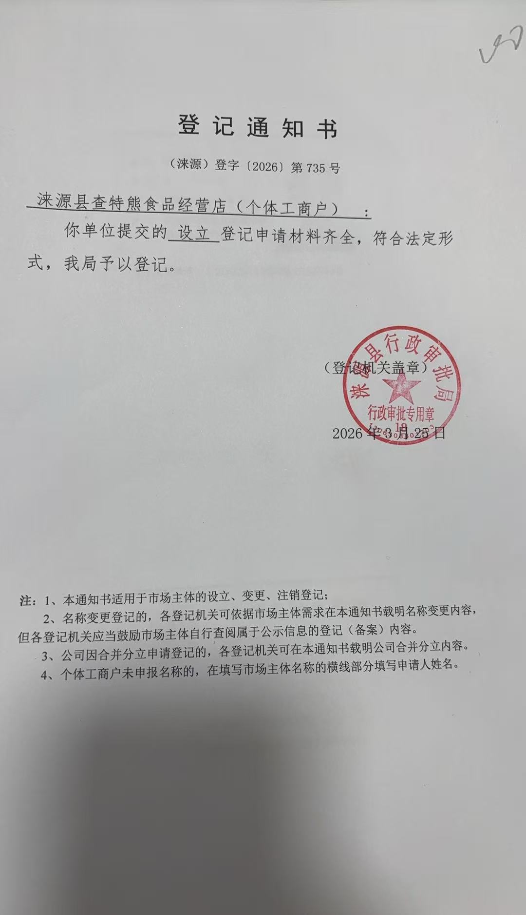 关于涞源县查特熊食品经营店许可的公开
