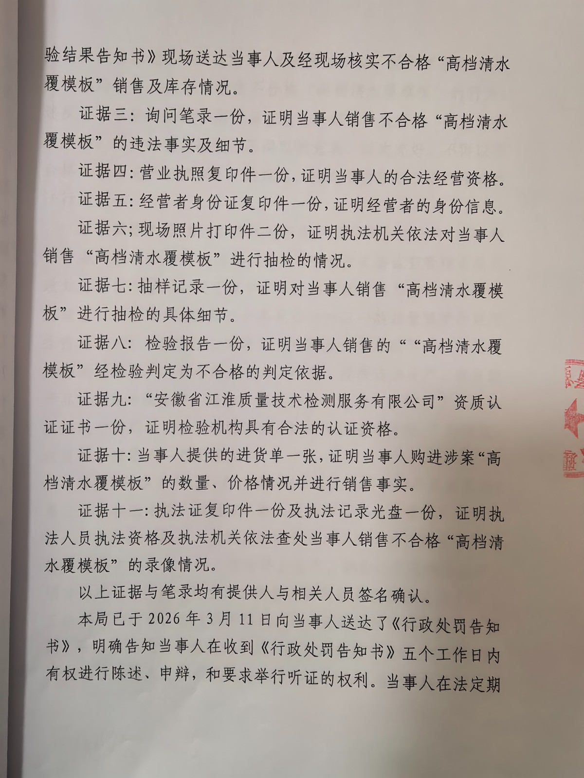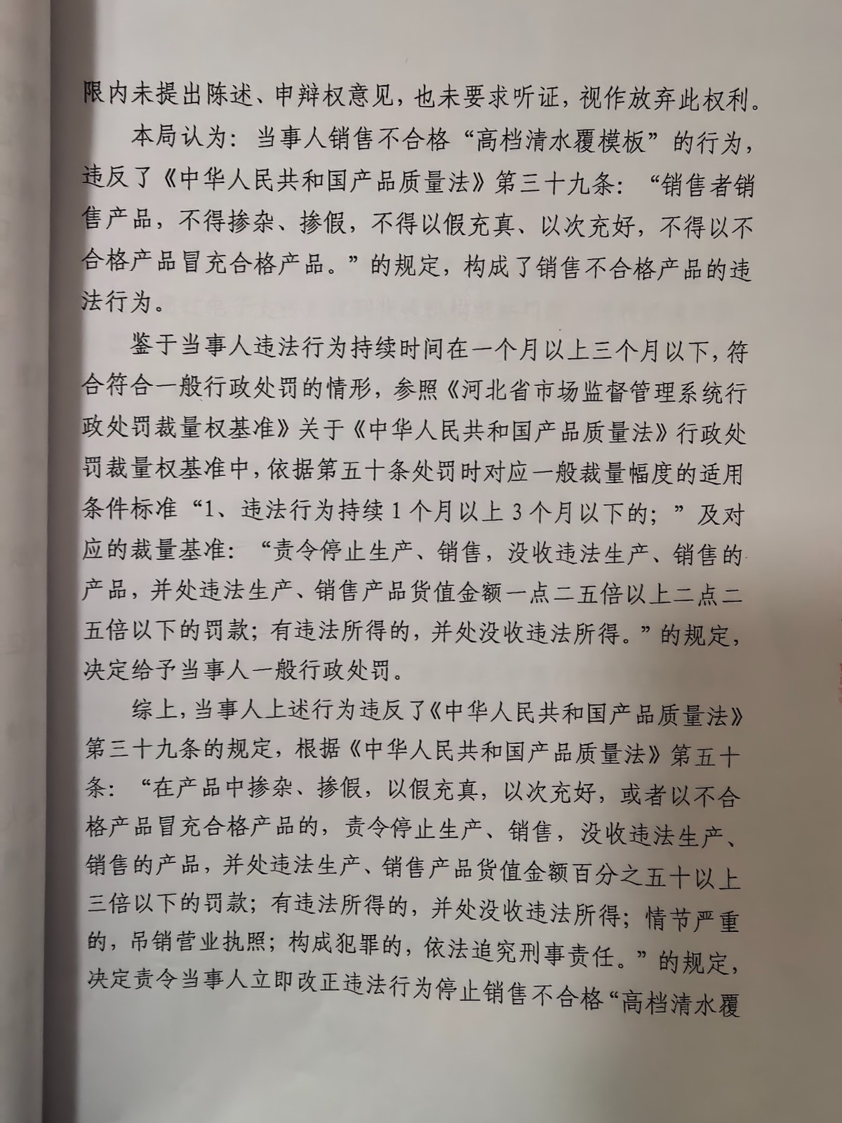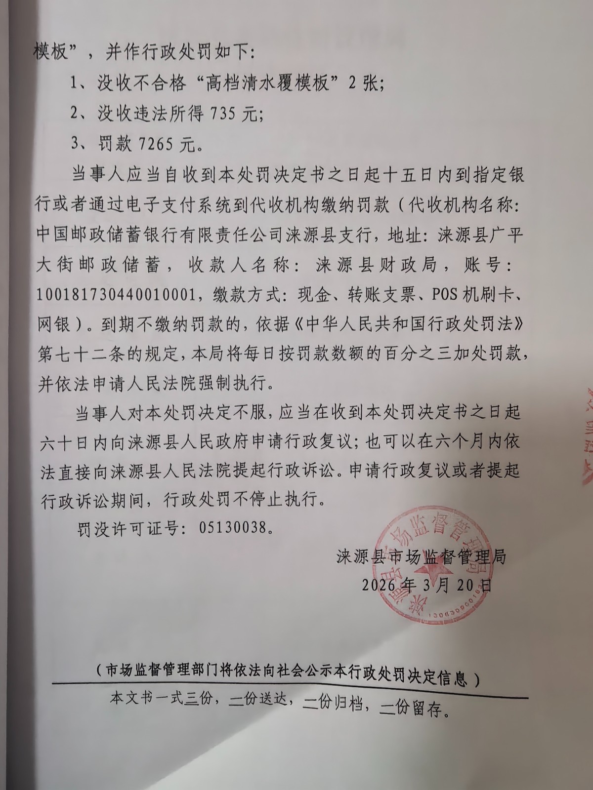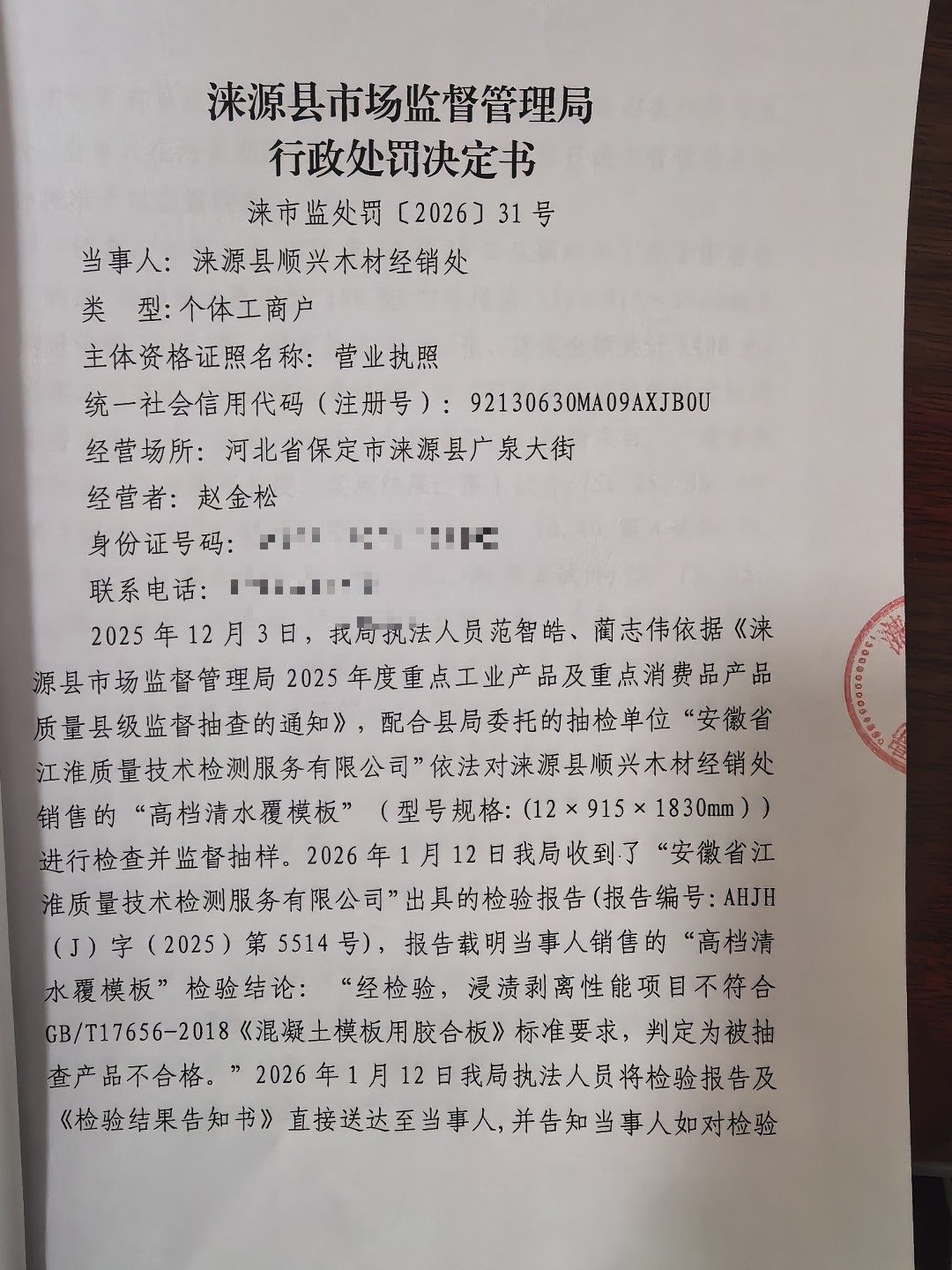 涞市监处罚〔2026〕31号,涞源县顺兴木材经销处销售不合格“高档清水覆模板”案