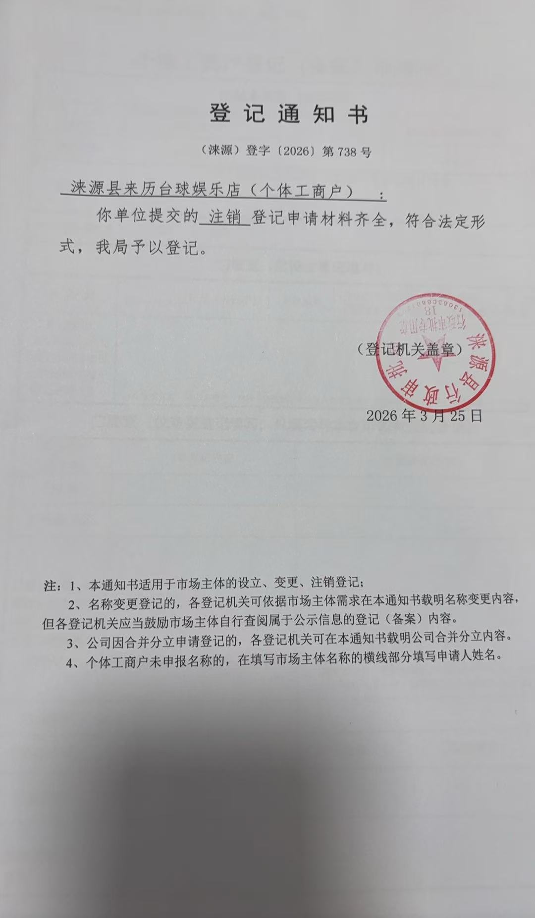 关于涞源县来历台球娱乐店许可的公开