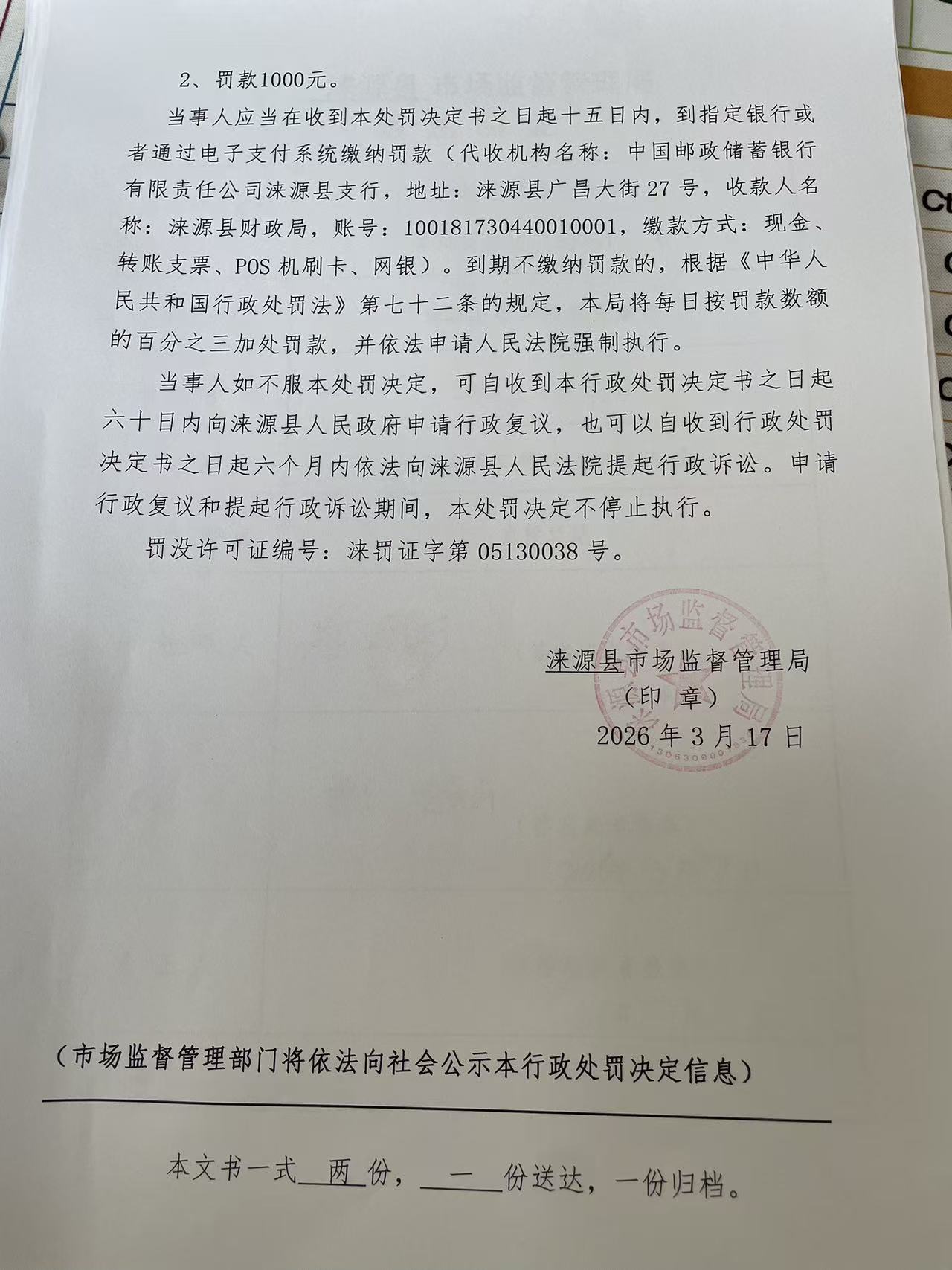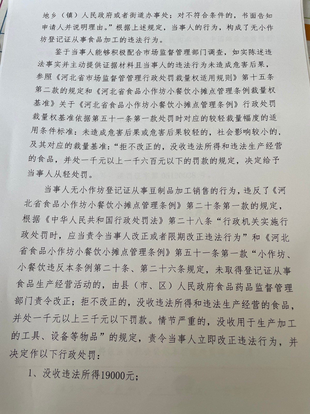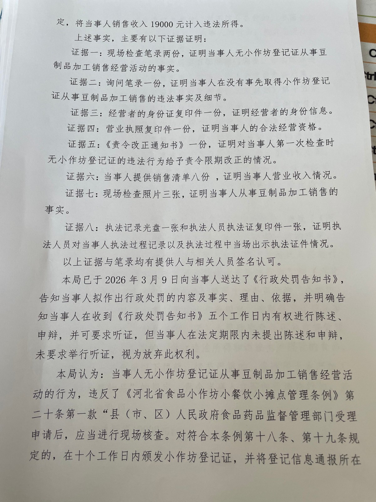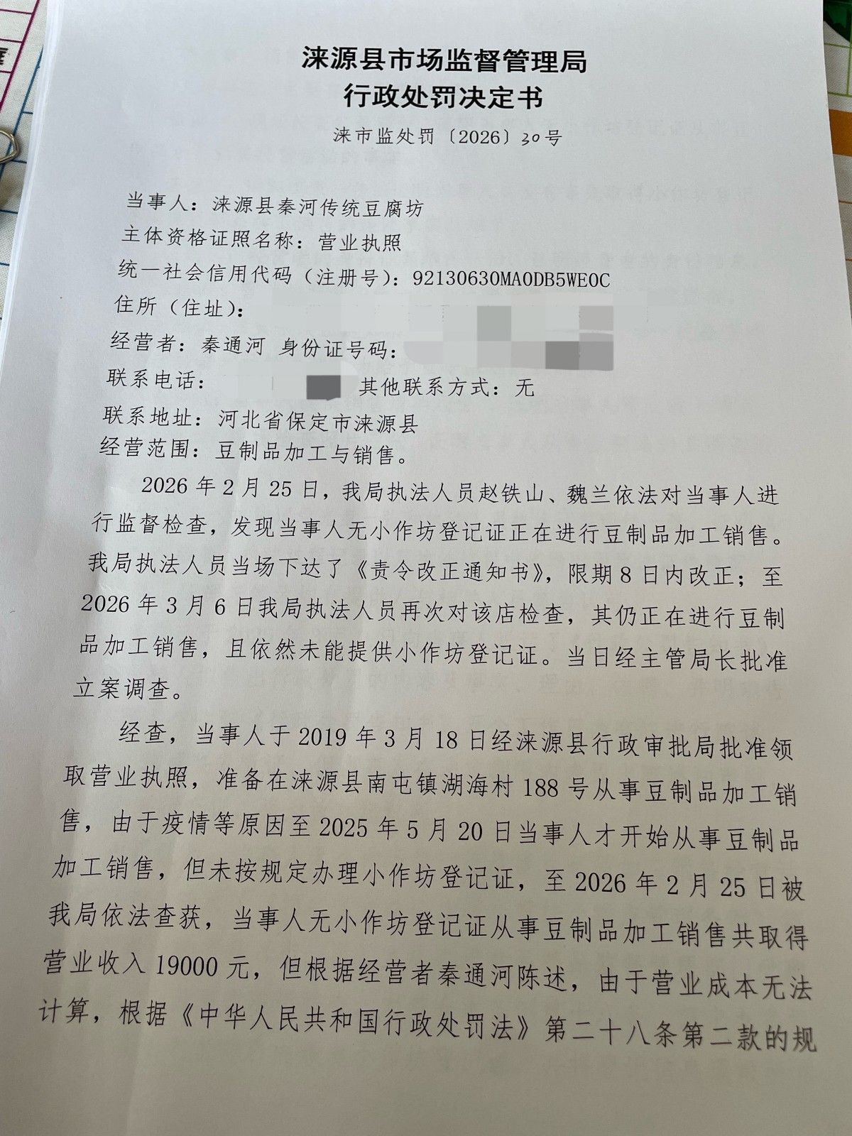 涞市监处罚(2026)30号,涞源县秦河传统豆腐坊无小作坊登记证从事食品加工案