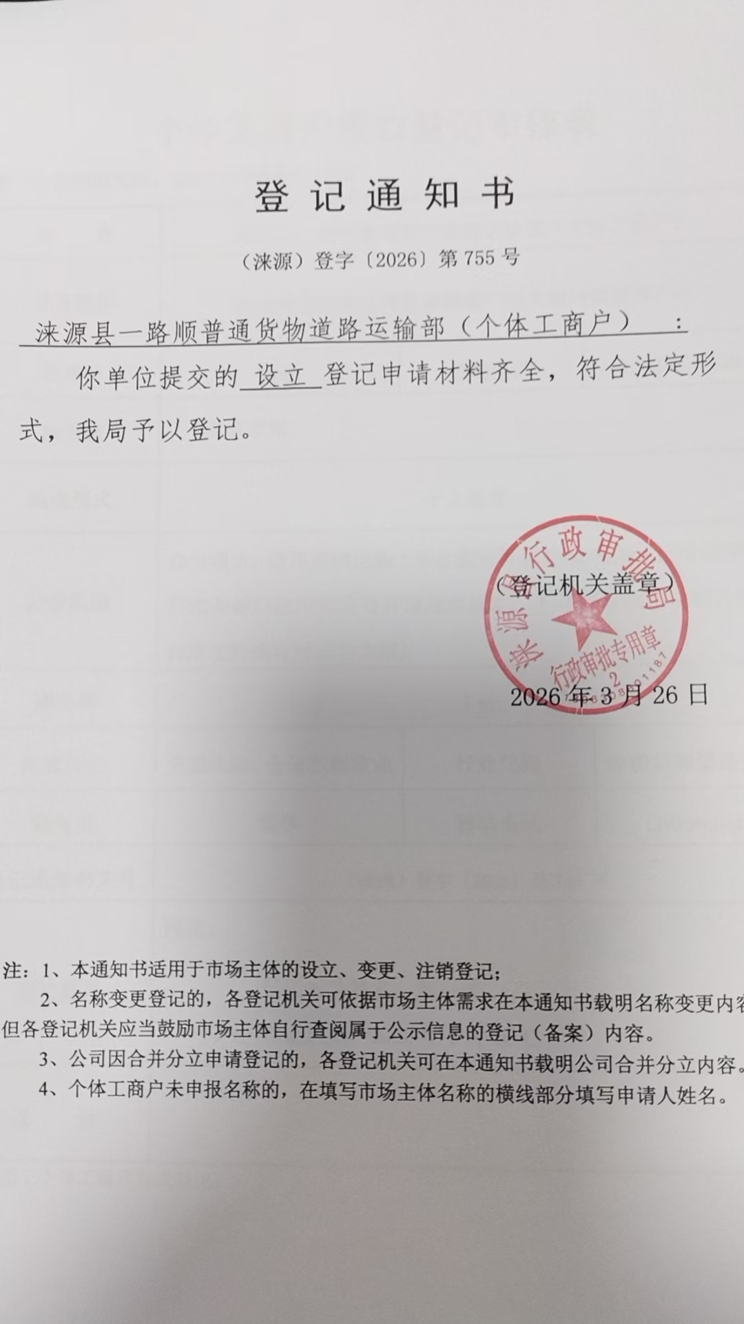 涞源县一路顺普通货物道路运输部登记通知书.jpg