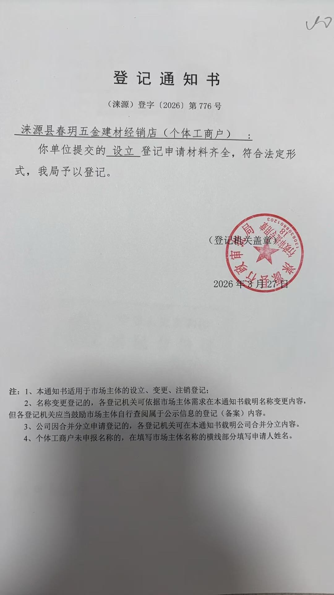 关于涞源县春玥五金建材经销店许可的公开