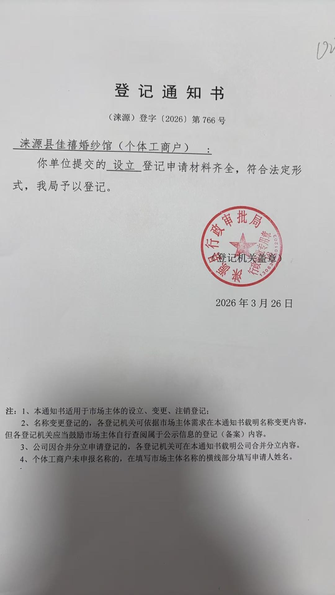 关于涞源县佳禧婚纱馆许可的公开