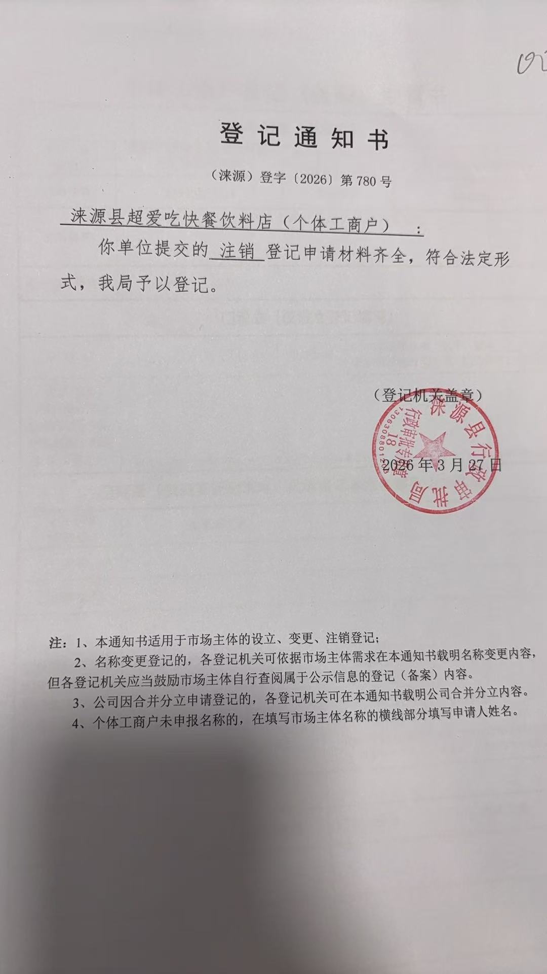 关于涞源县超爱吃快餐饮料店许可的公开