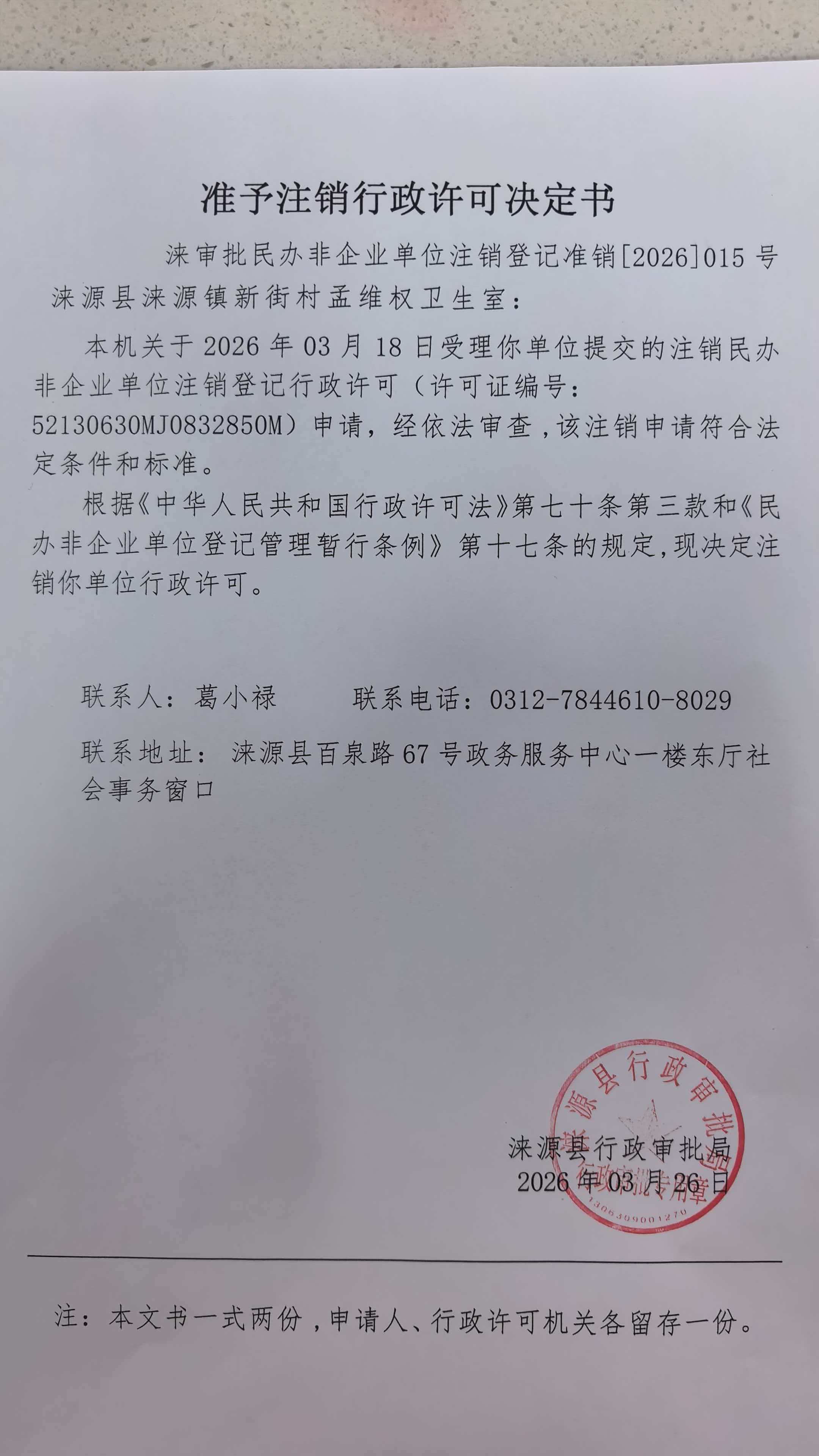 涞源县涞源镇新街村孟维权卫生室行政许可决定书.jpg