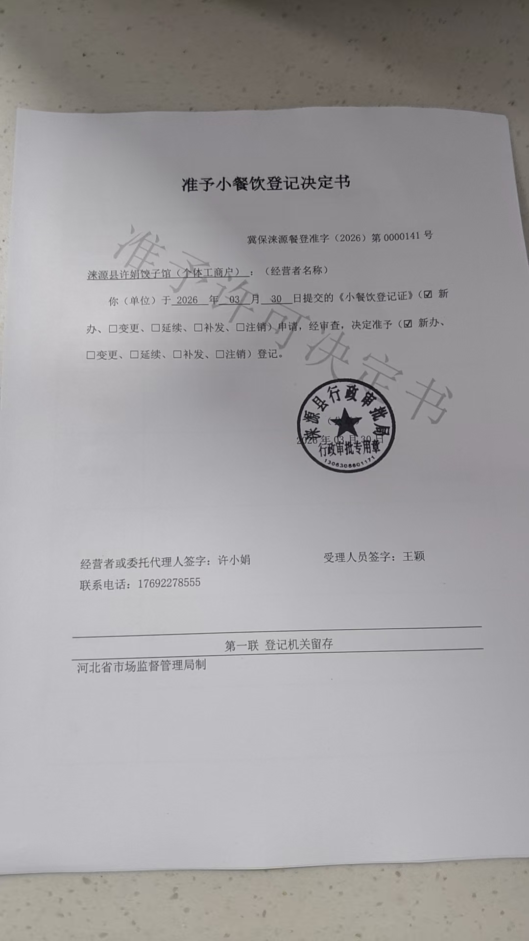 关于涞源县许娟饺子馆准予食品小餐饮登记决定的公示
