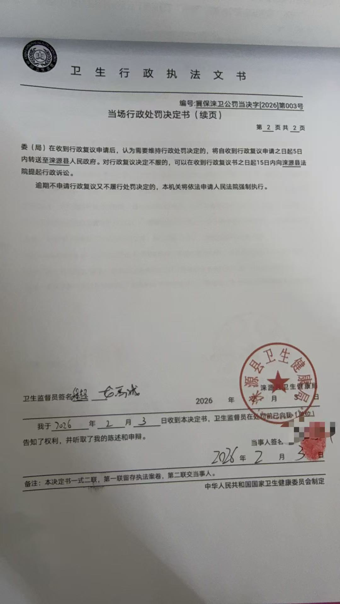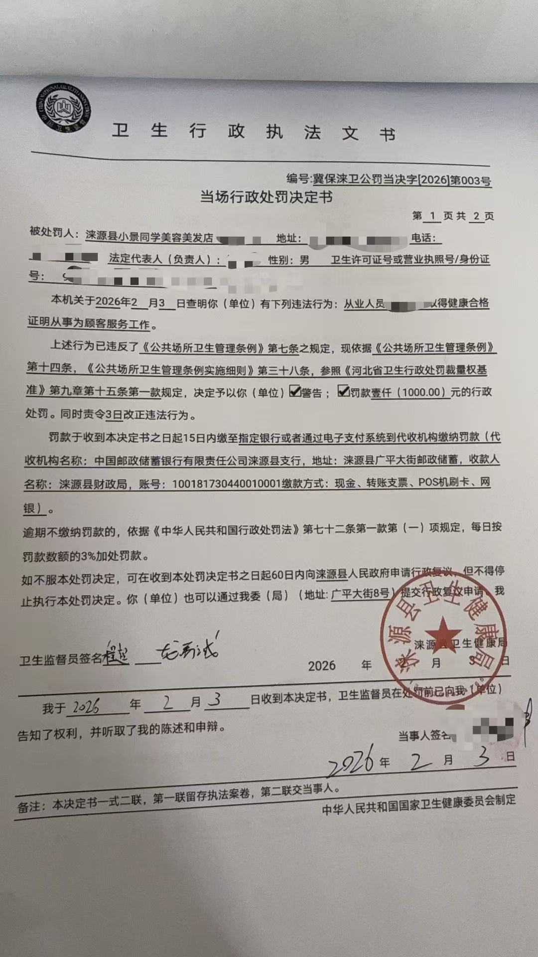 冀保涞卫公罚当决字【2026】第003号涞源县小景同学美容美发店违反《公共场所卫生管理条例》案