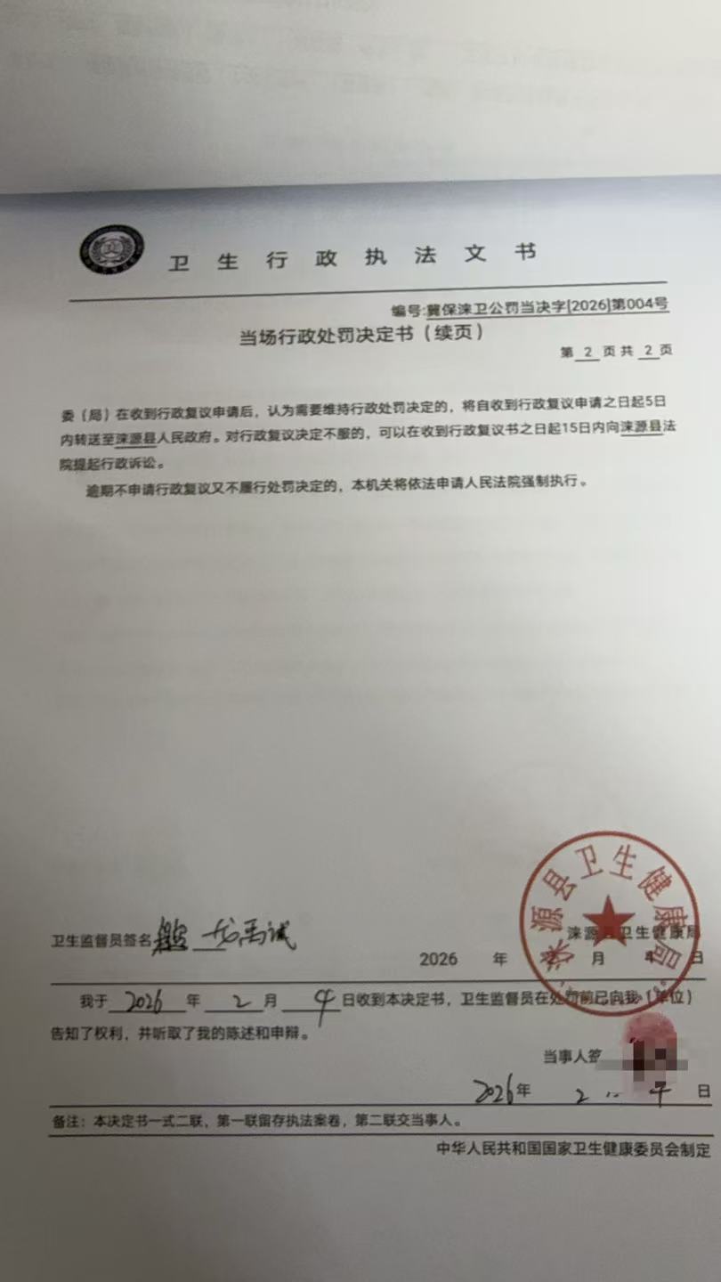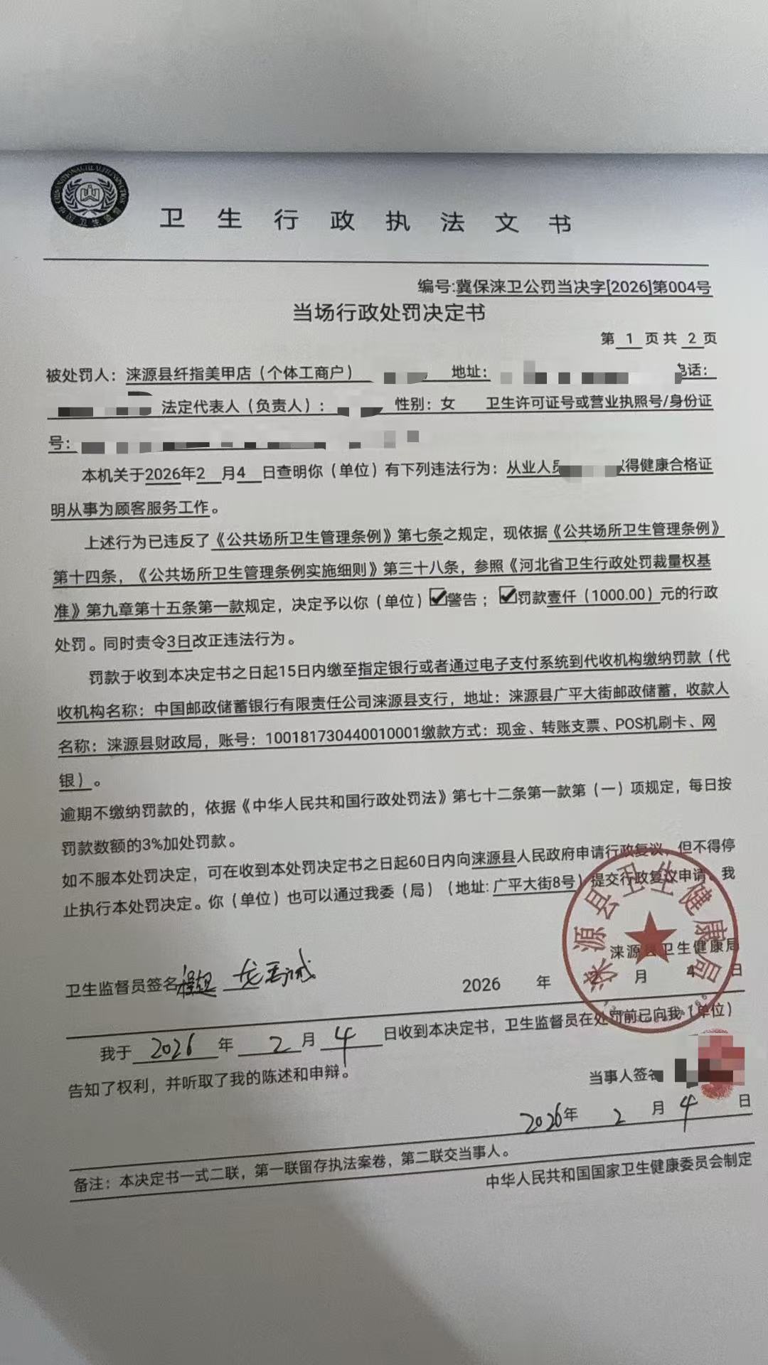 冀保涞卫公罚当决字【2026】第004号涞源县纤指美甲店违反《公共场所卫生管理条例》案