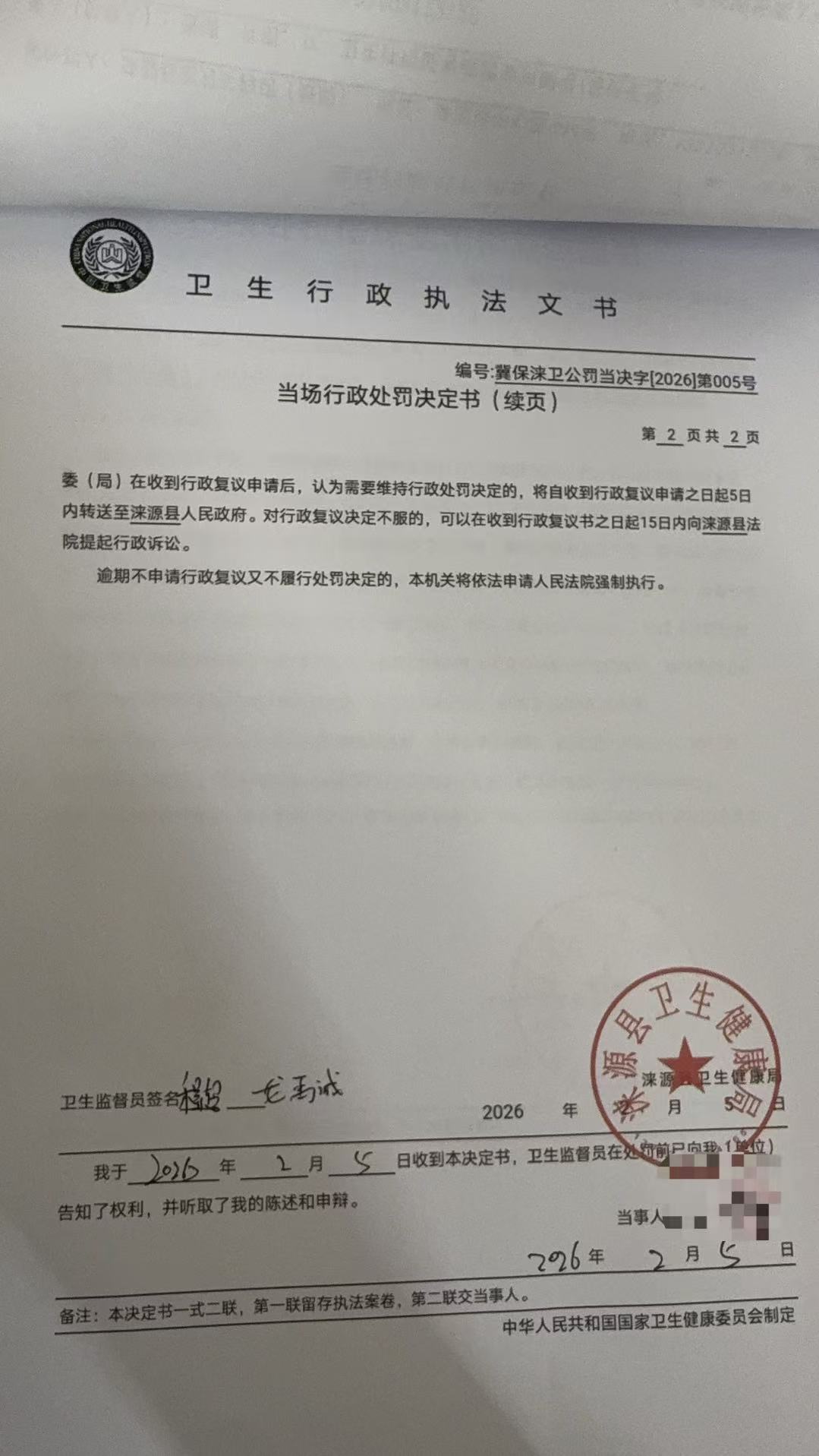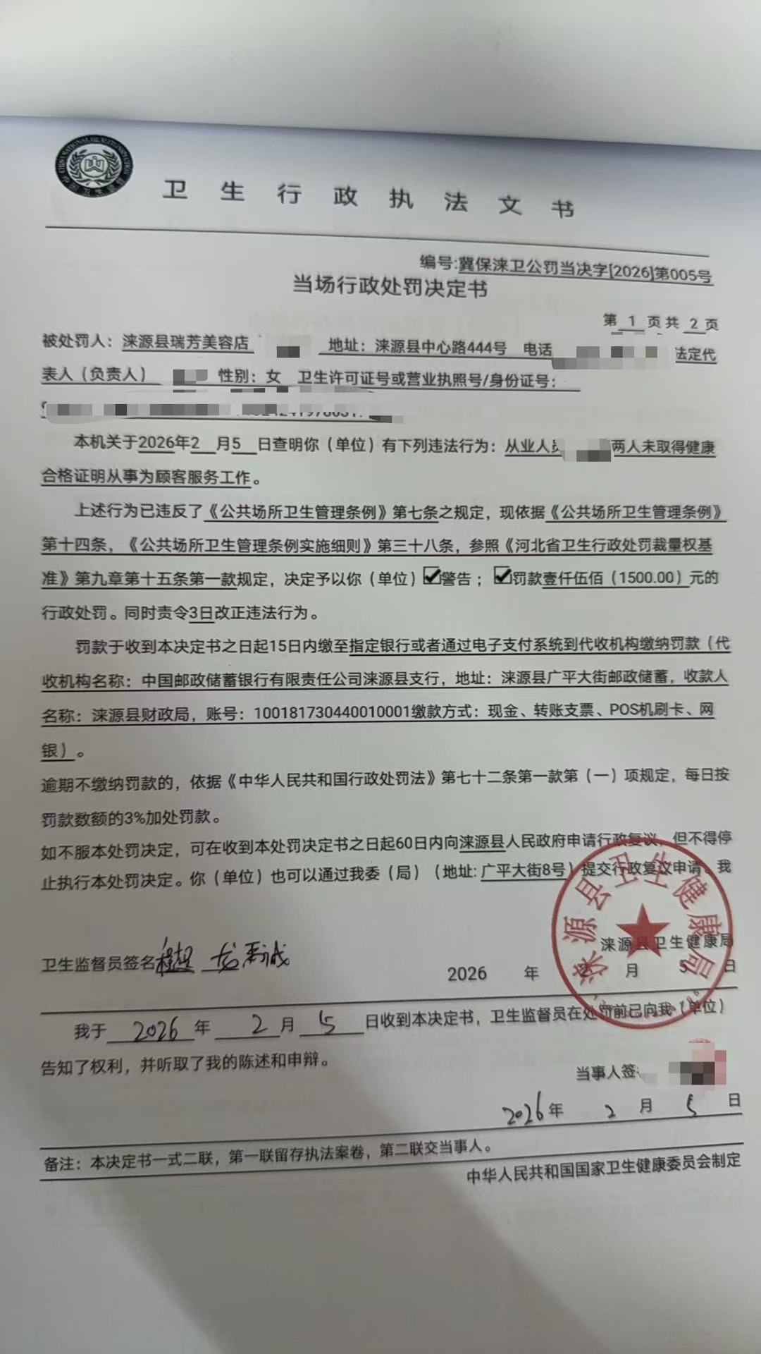 冀保涞卫公罚当决字【2026】第005号涞源县瑞芳美容店违反《公共场所卫生管理条例》案