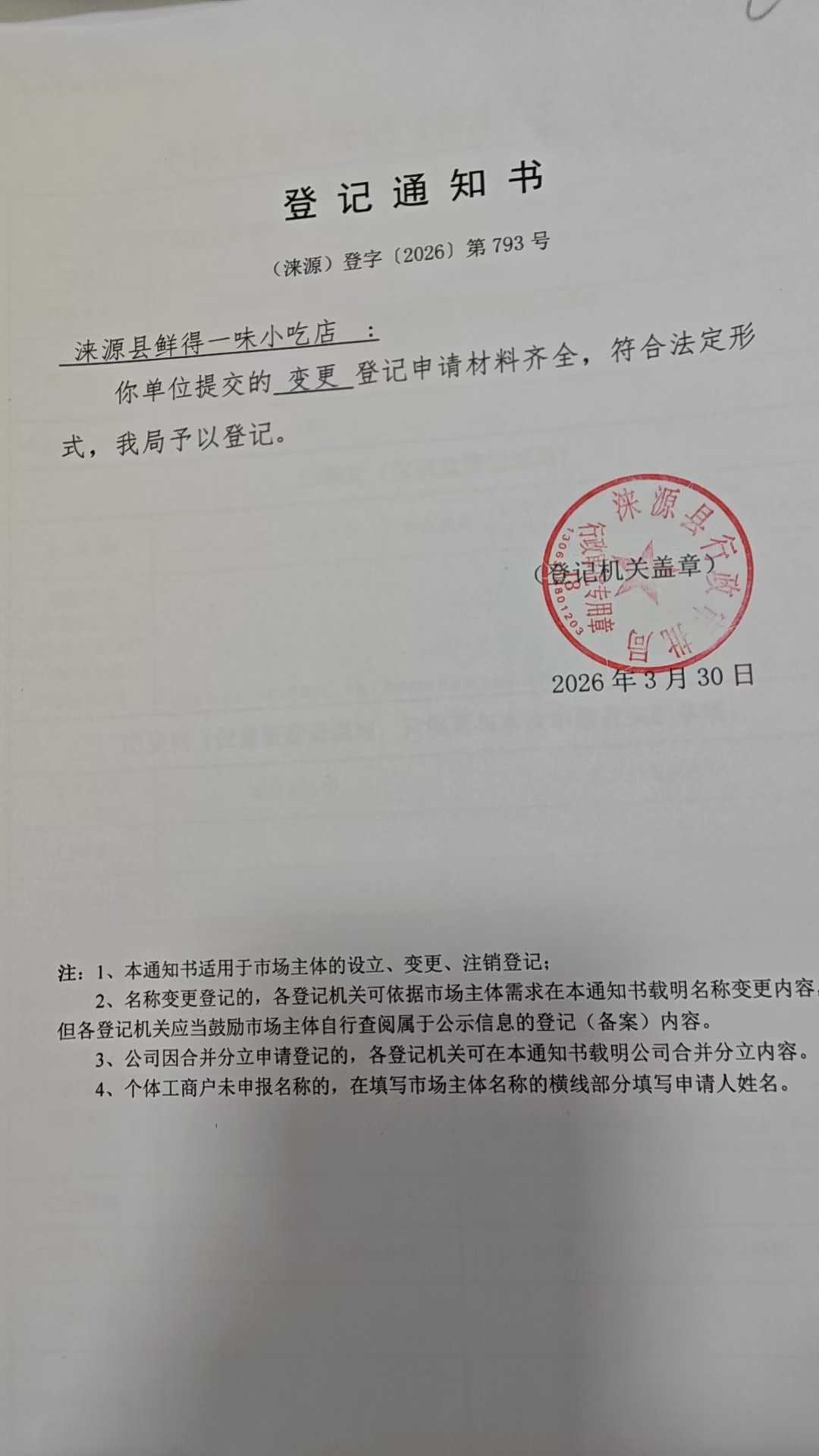 关于涞源县鲜得一味小吃店许可的公开