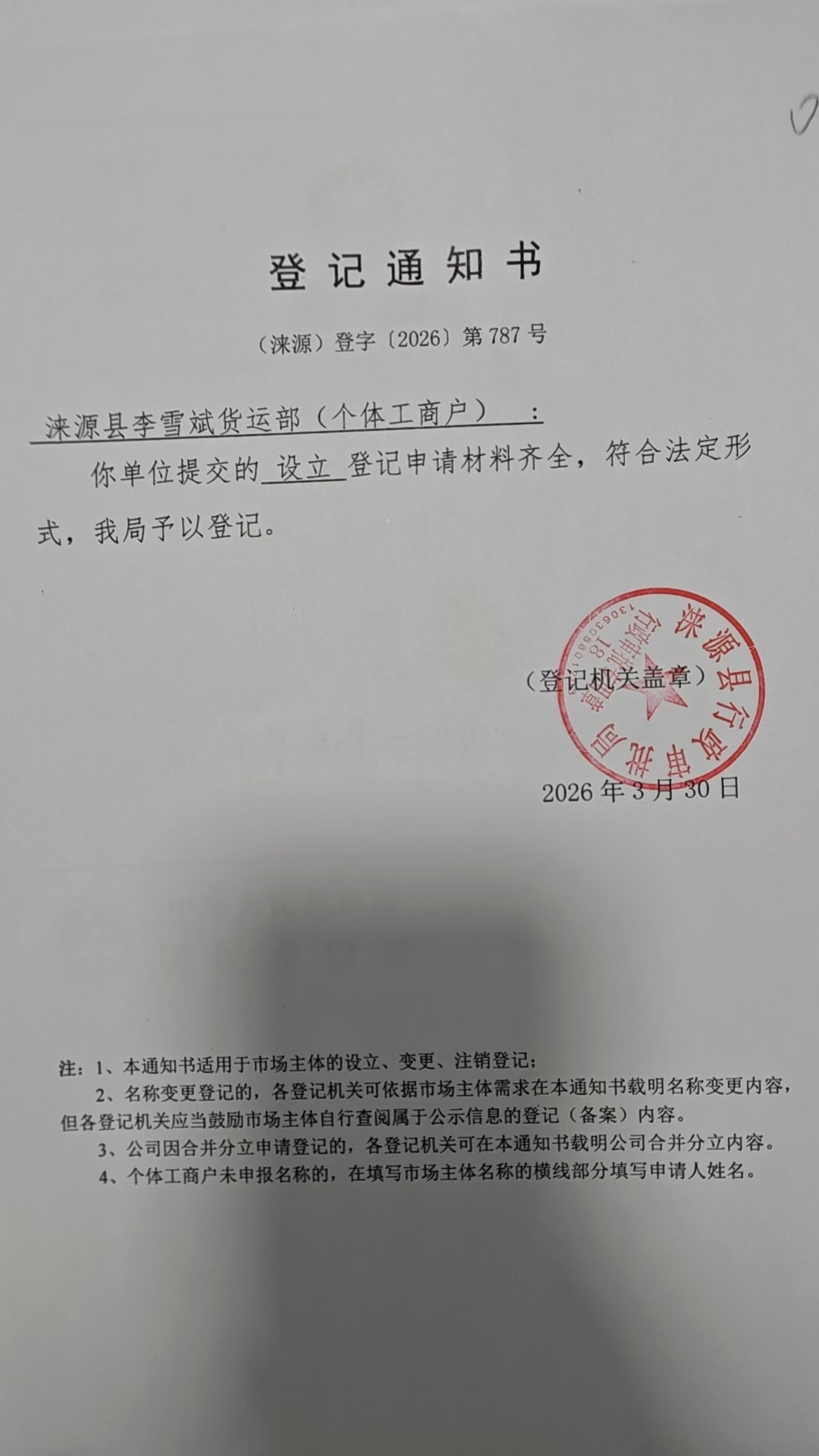 关于涞源县李雪斌货运部许可的公开
