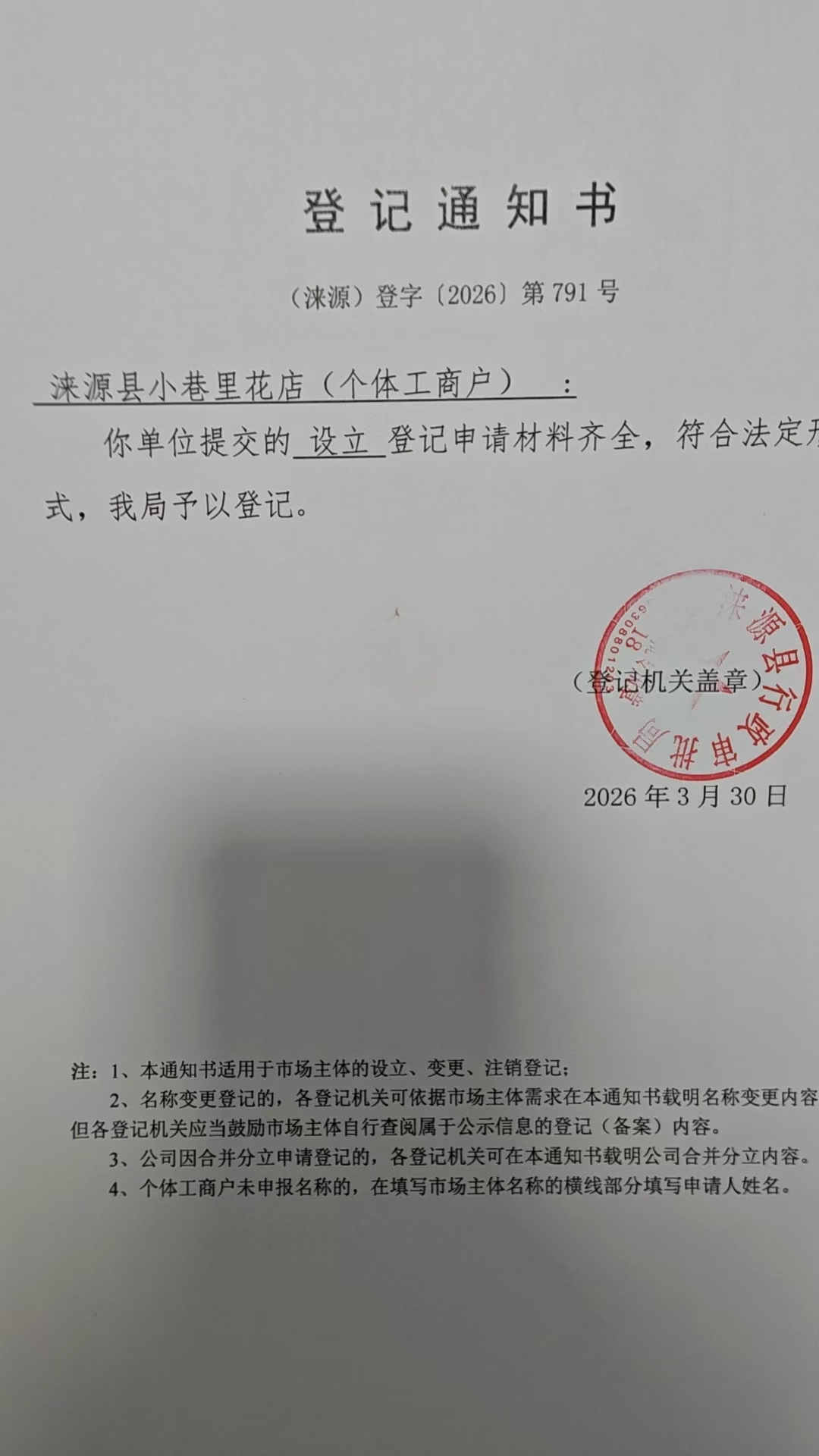 关于涞源县小巷里花店许可的公开