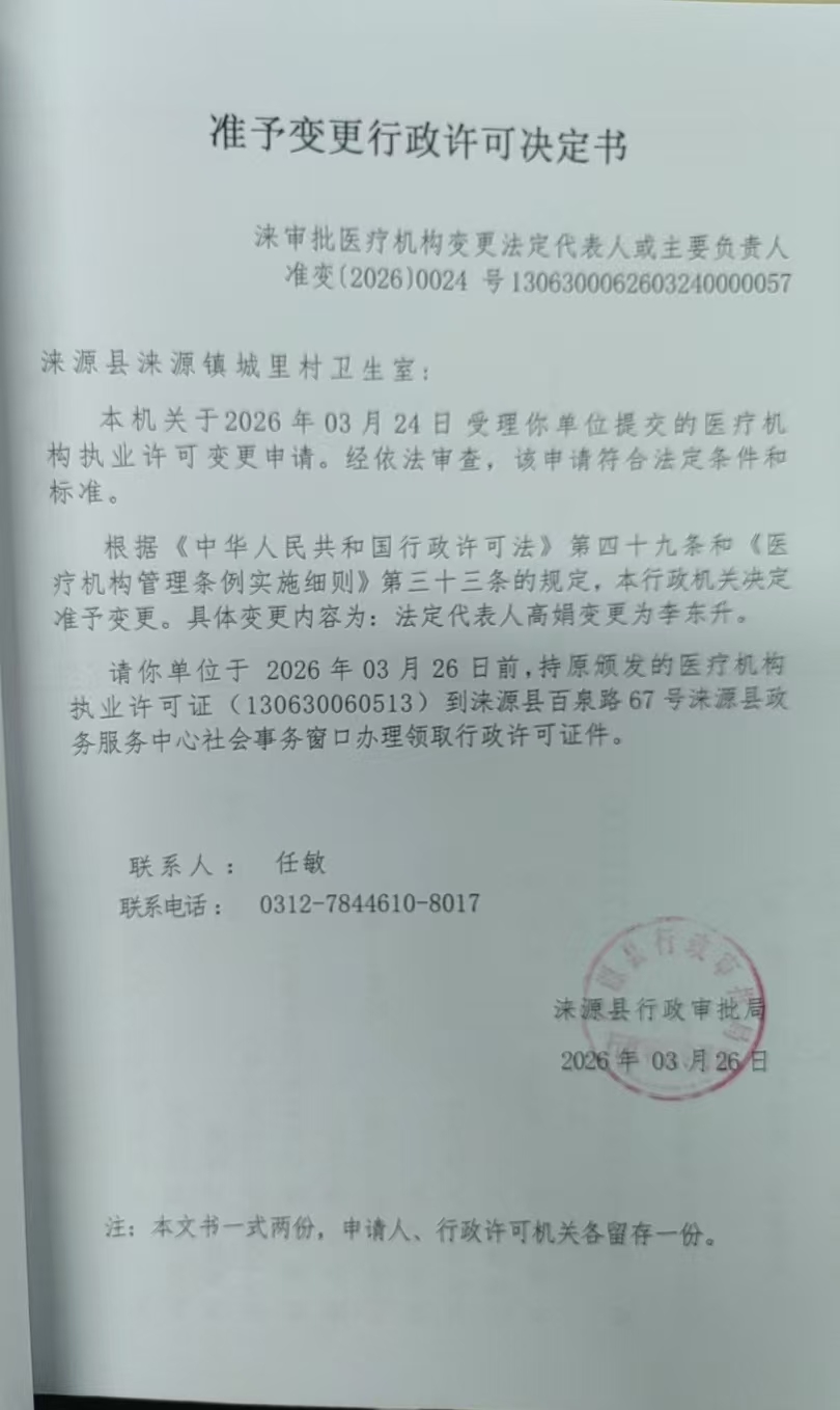 关于涞源县涞源镇城里村卫生室医疗机构执业许可变更的公示