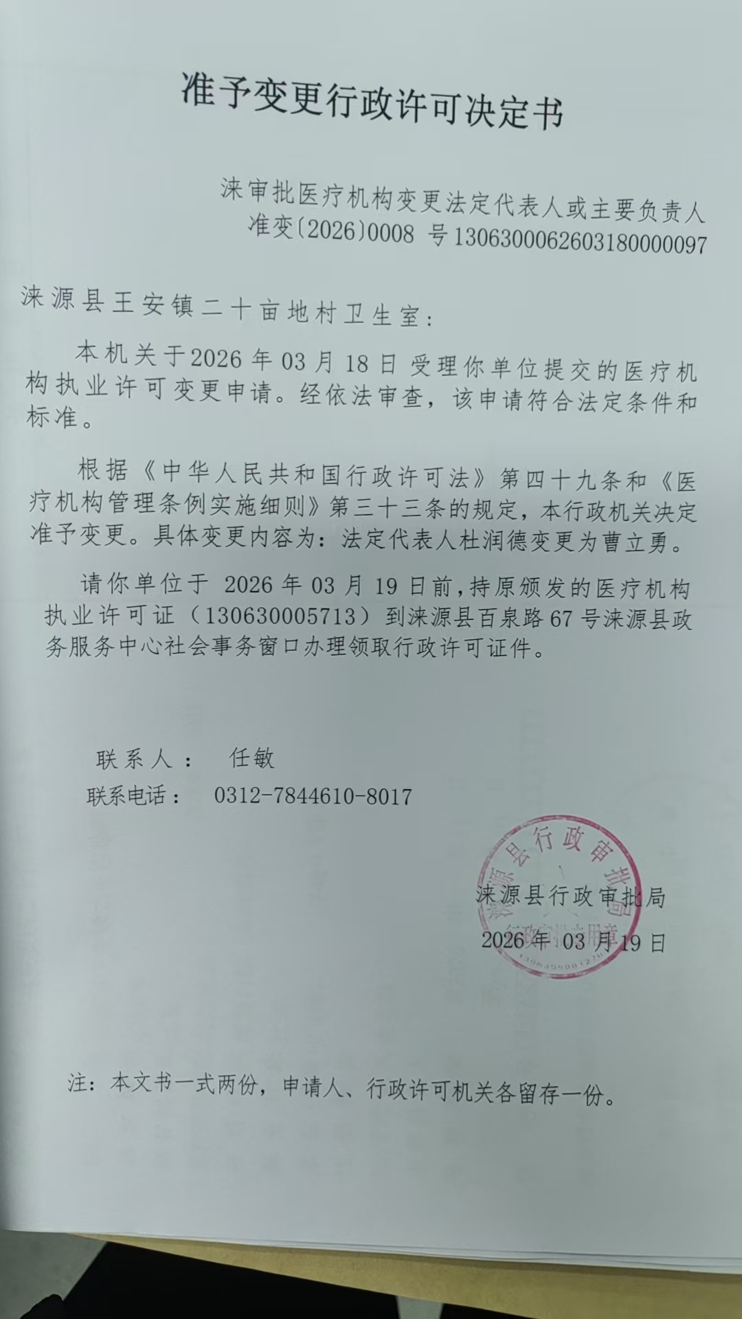关于涞源县王安镇二十亩地村卫生室医疗机构执业许可变更的公示