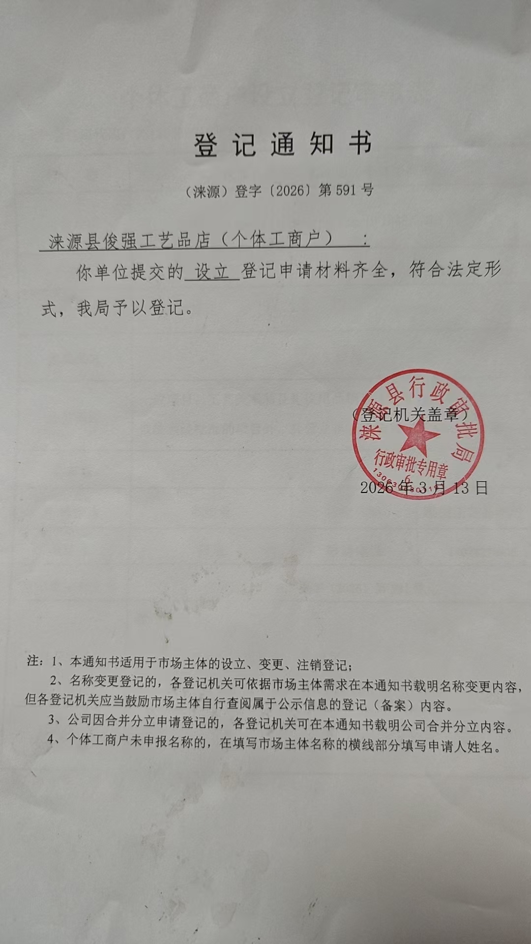 关于涞源县俊强工艺品店设立的公示