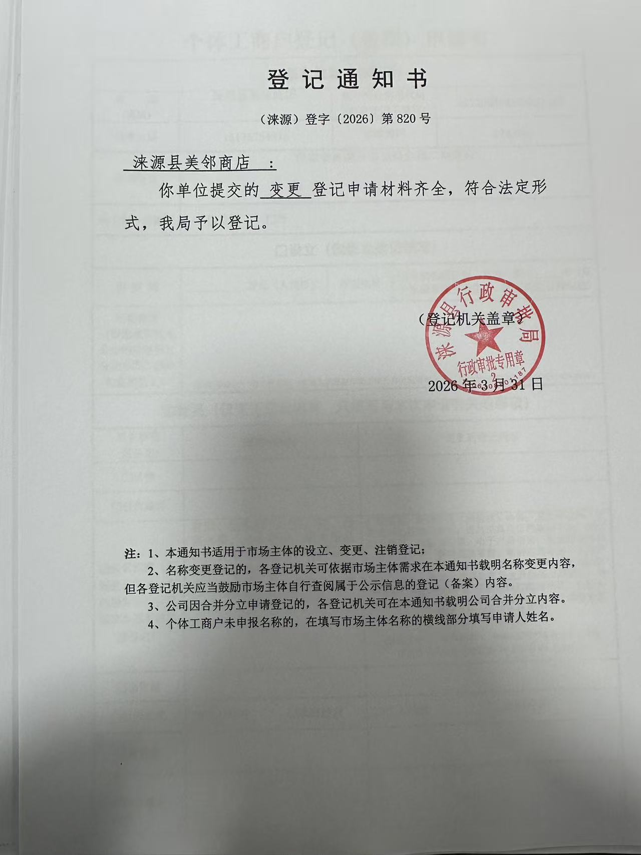 关于涞源县美邻商店变更的公示