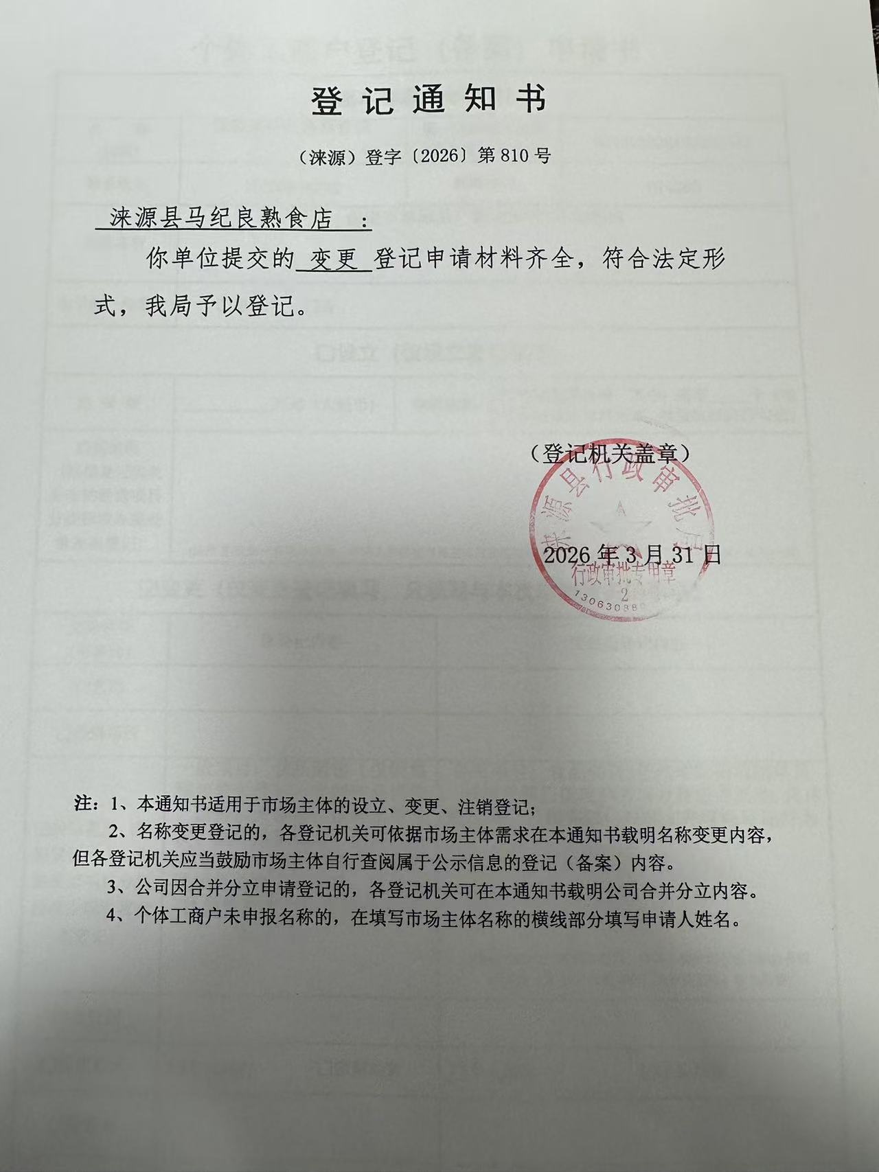 关于涞源县马纪良熟食店变更的公示