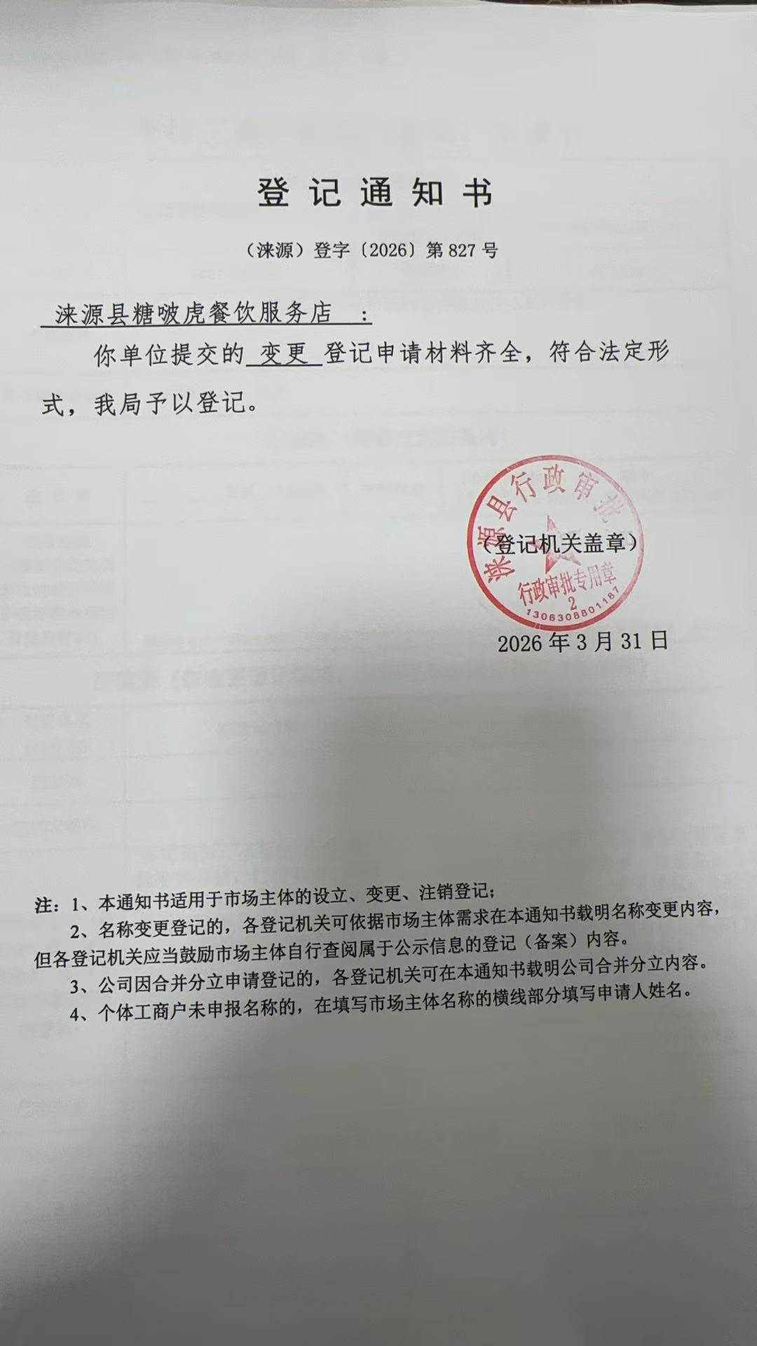 关于涞源县糖啵虎餐饮服务店变更公示