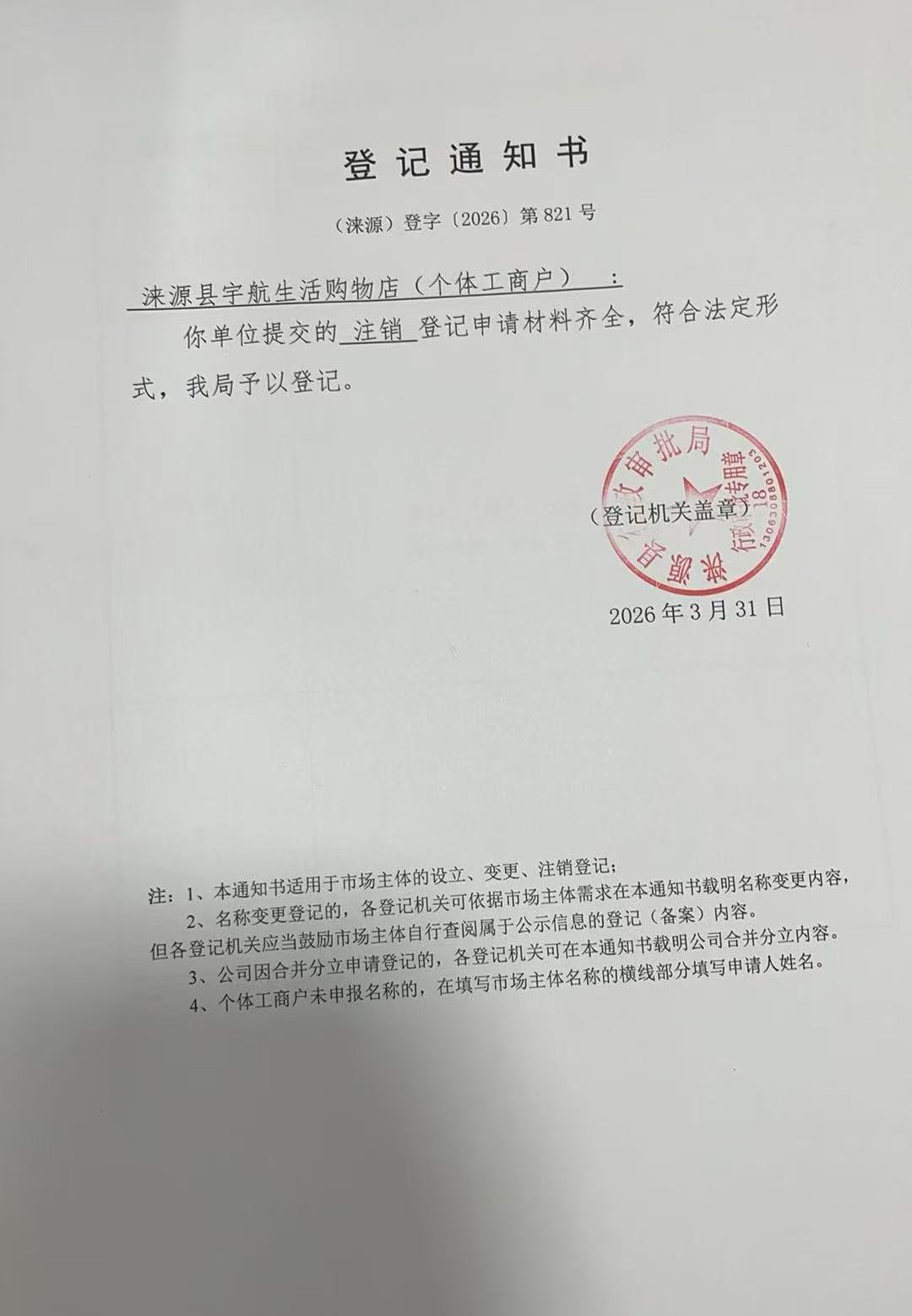 关于涞源县宇航生活购物店许可的公开