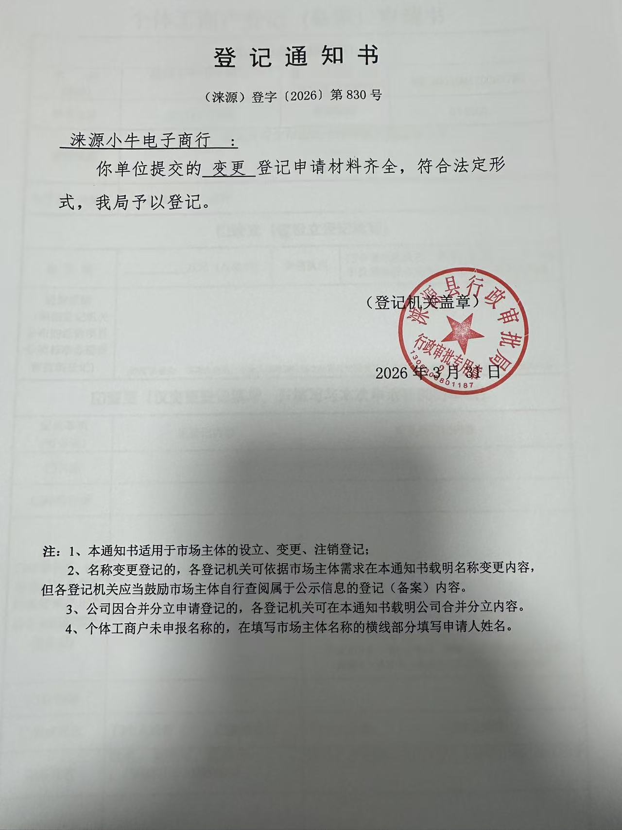 关于涞源小牛电子商行变更的公示