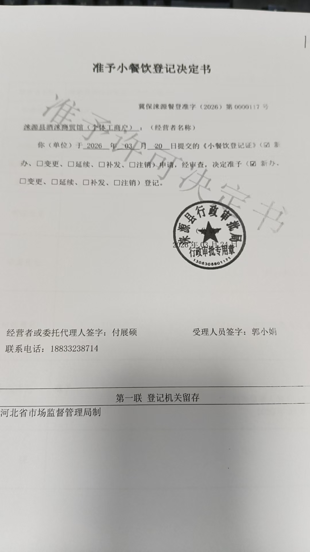 涞源县酒涞商贸馆准予小餐饮登记决定书.jpg