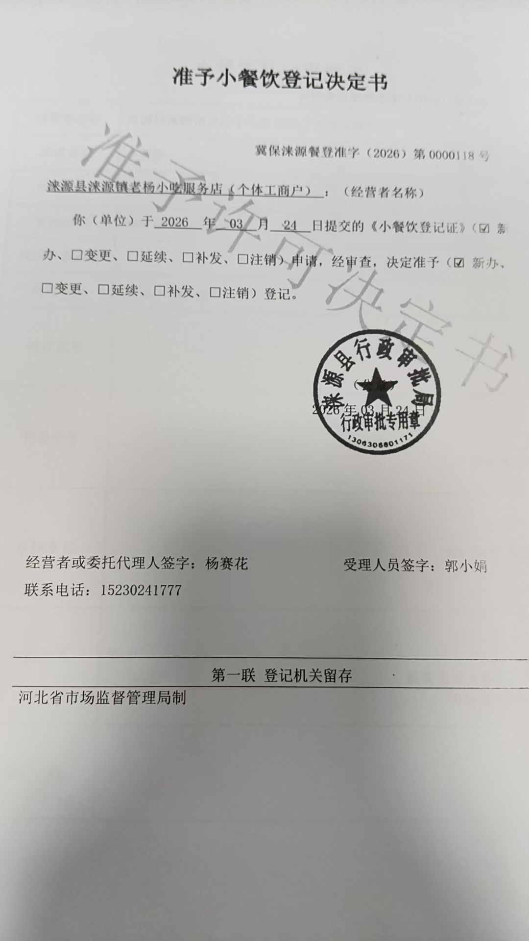 涞源县涞源镇老杨小吃服务店准予小餐饮登记通知书.jpg