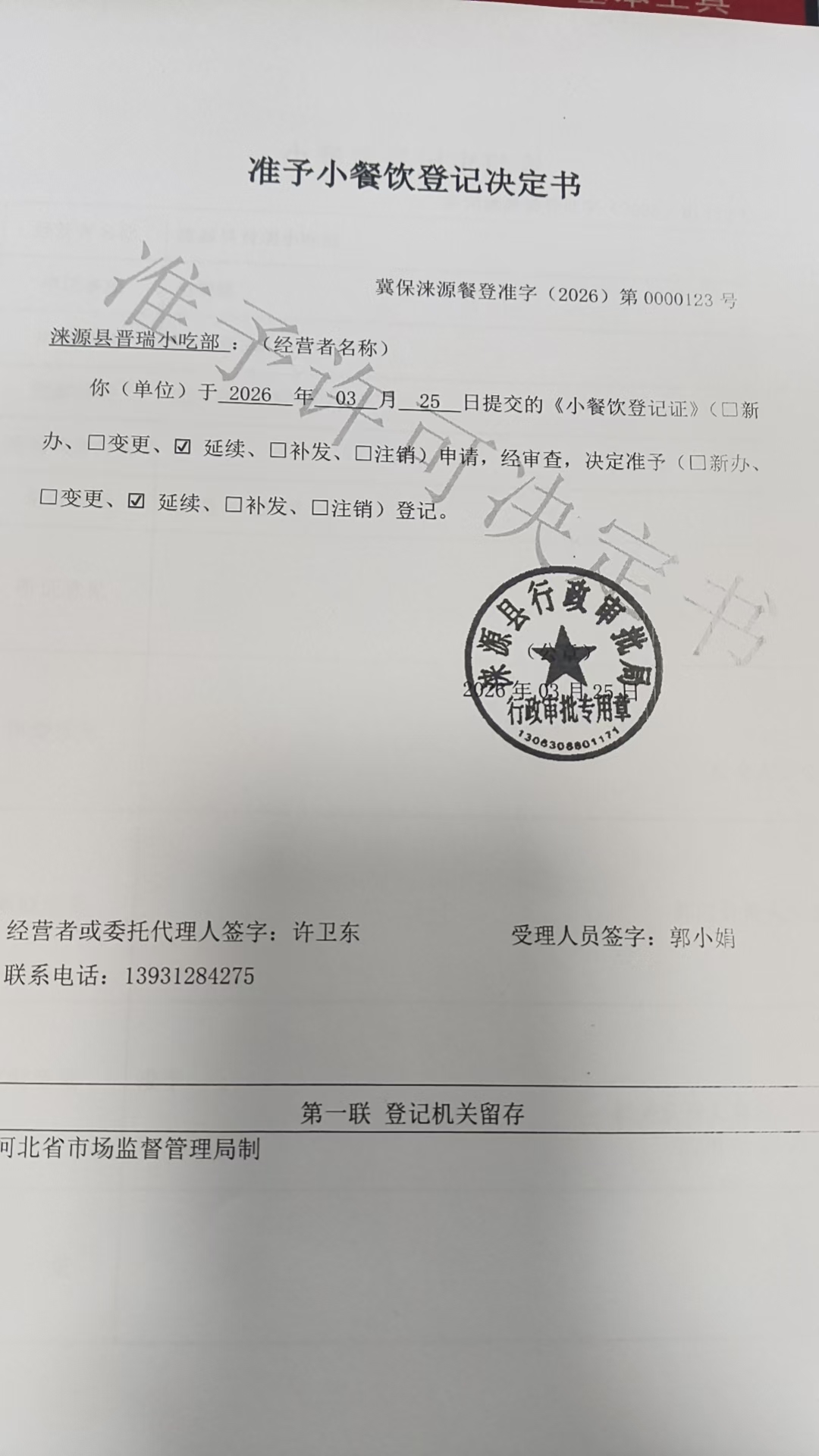 涞源县晋瑞小吃部准予小餐饮登记决定书.jpg