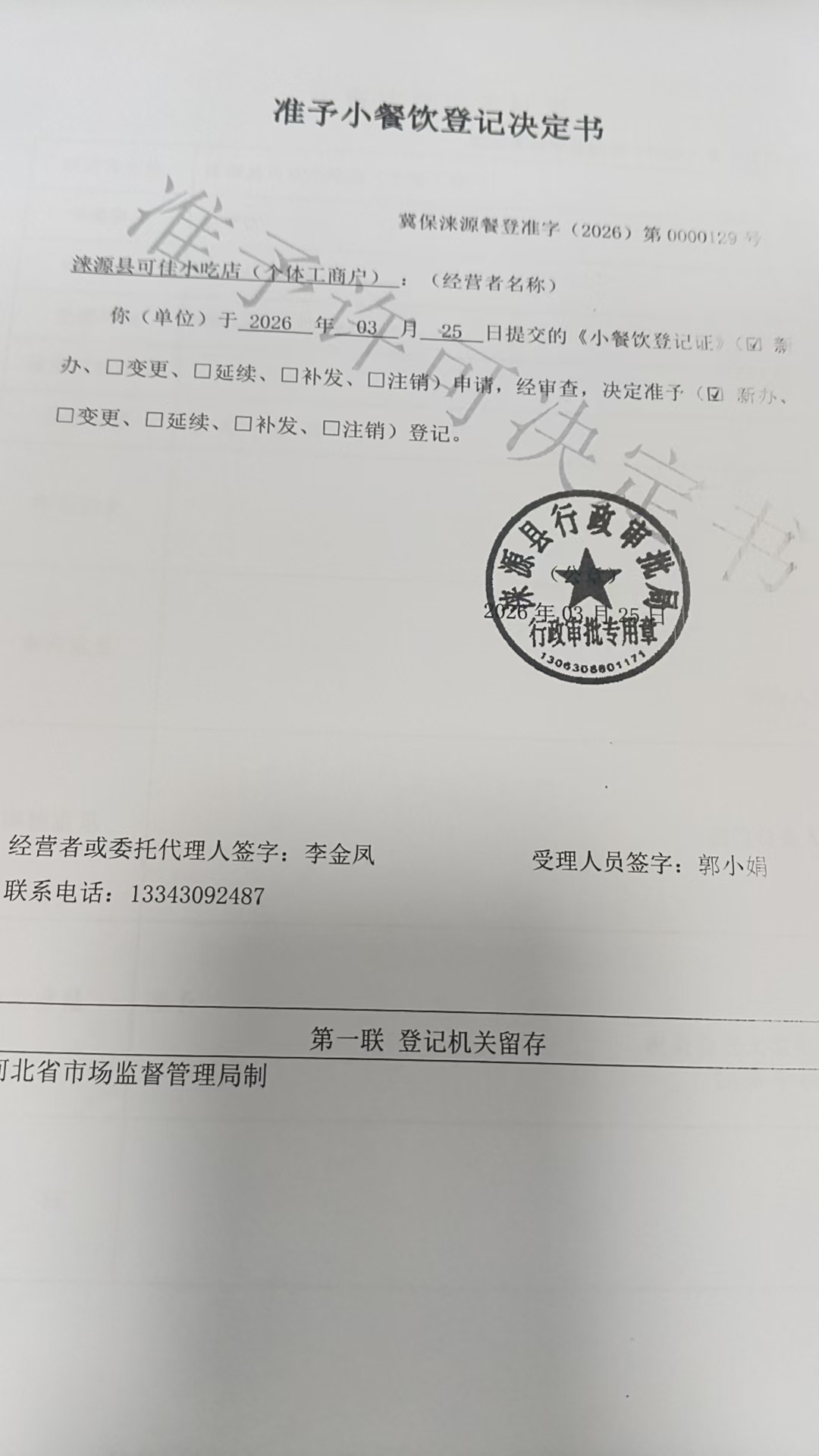 涞源县可佳小吃店准予小餐饮登记决定书.jpg