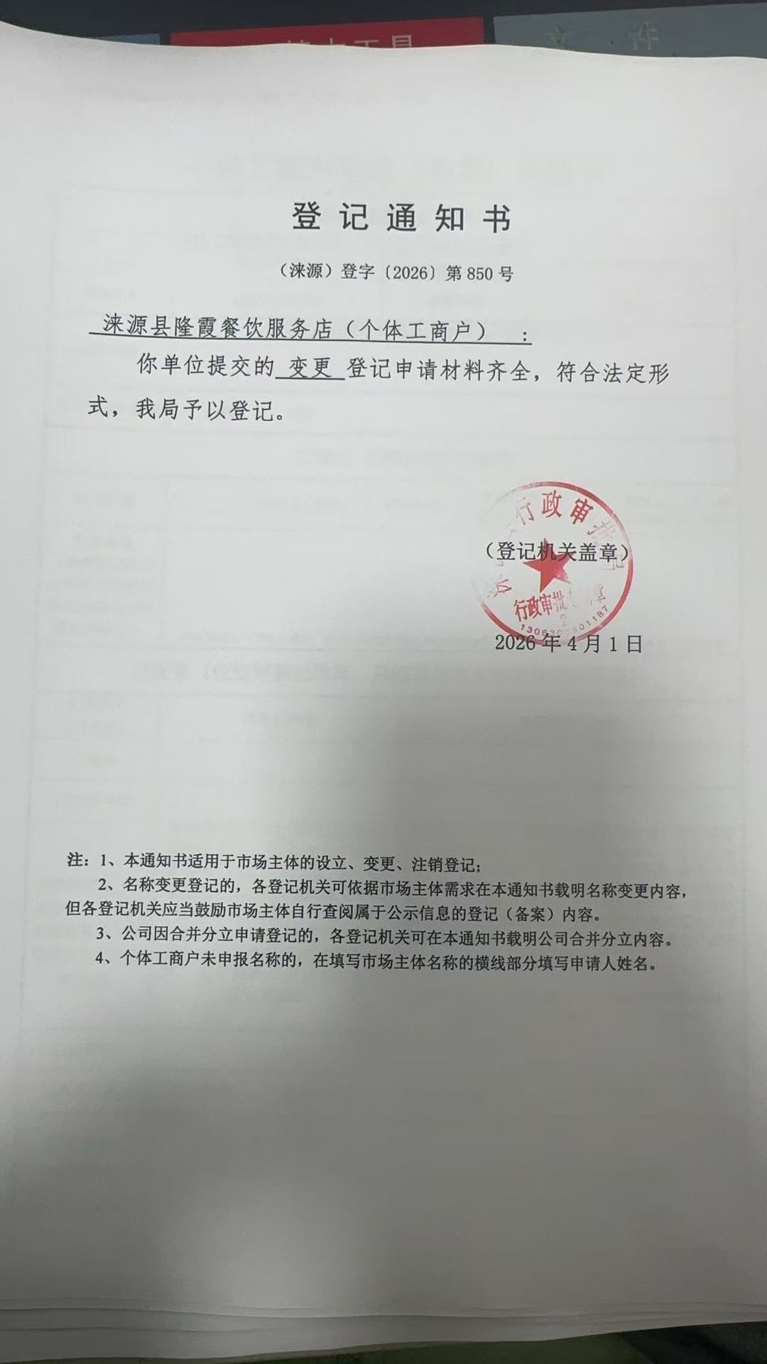 关于涞源县隆霞餐饮服务店变更的公示